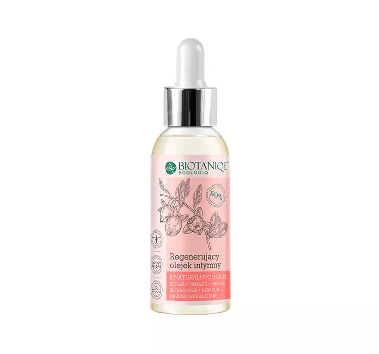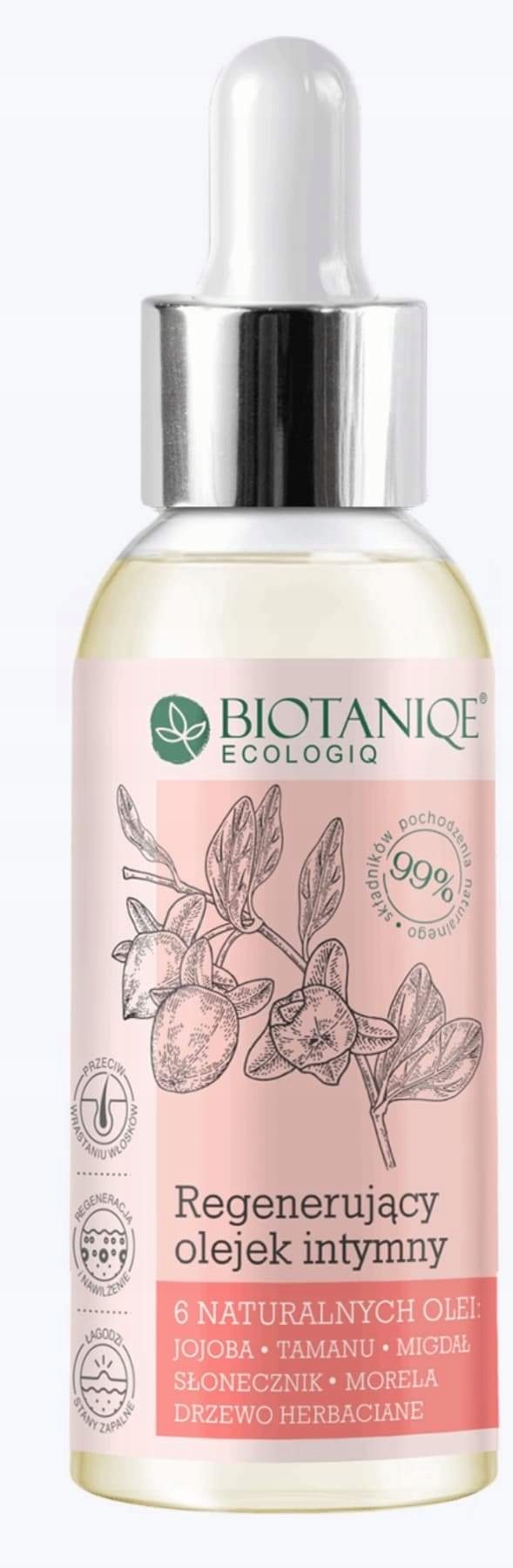 Regenerujący olejek intymny Biotaniqe Ecologiq ma uniwersalne działanie pielęgnujące Zawiera połączenie aż 6 olei, które głęboko nawilżają, odżywiają, regenerują i wygładzają skórę. Eliminuje wrastanie włosków po depilacji oraz uspokaja stany zapalne.