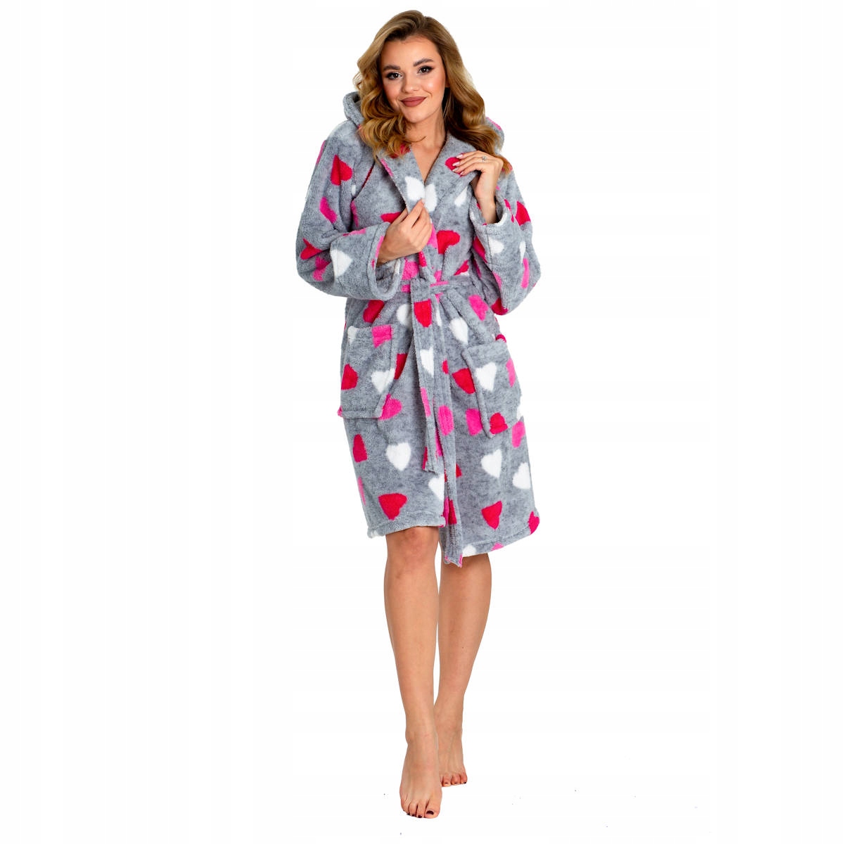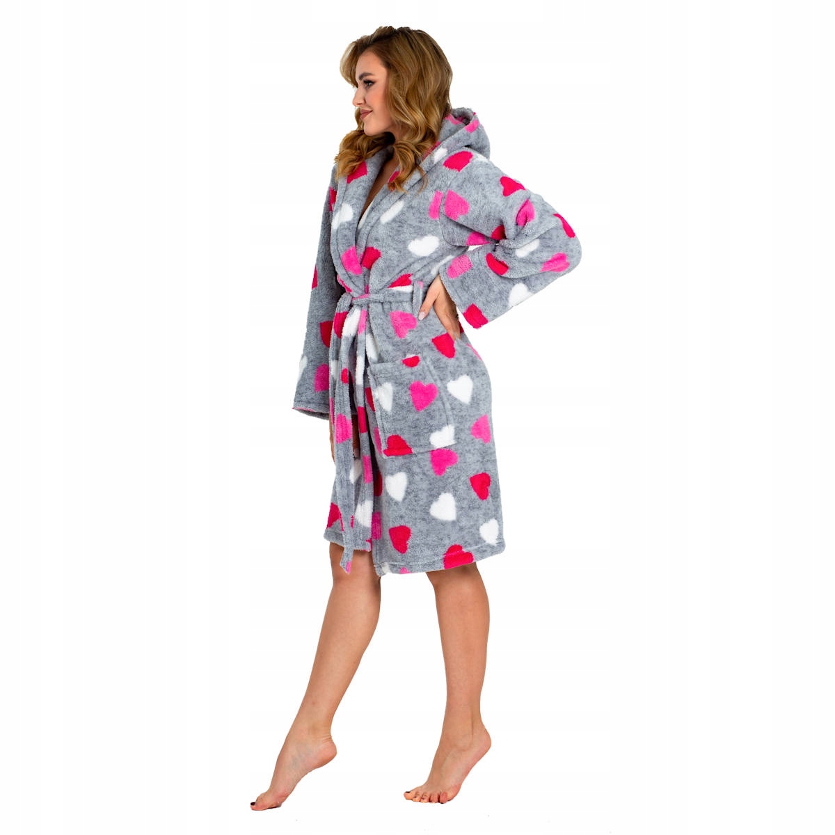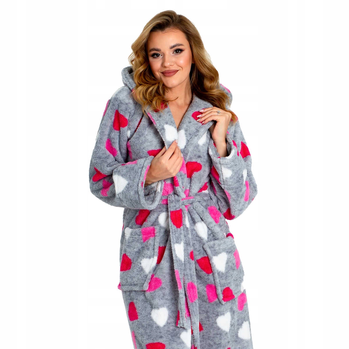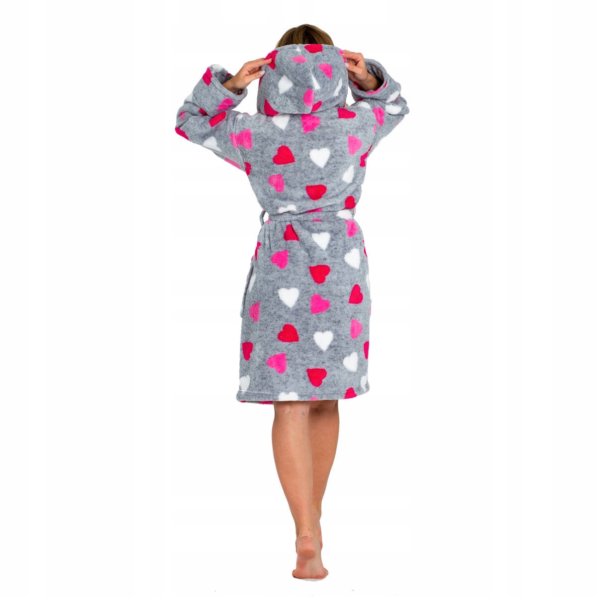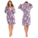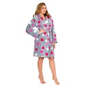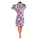 Damski, ciepły szlafrok w szarym kolorze z różowymi sercami, idealny na chłodne noce