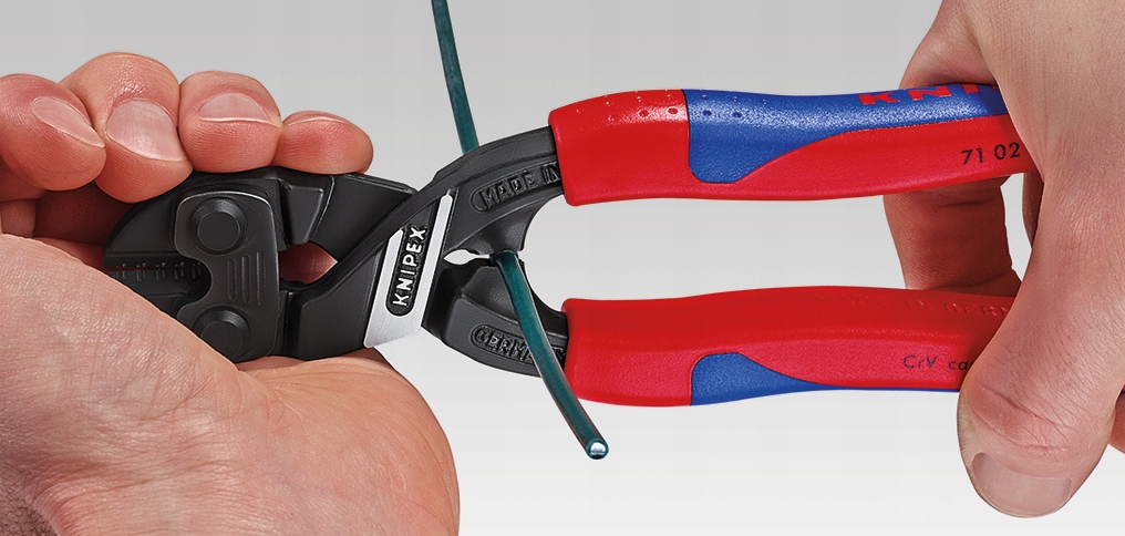Knipex CoBolt to kompaktowe szczypce tnące przegubowe. Wykonane ze stali chromowo-wanadowej o dużej wytrzymałości, kutej i wielokrotnie hartowane w kąpieli olejowej. Ostrza oddzielnie hartowane indukcyjnie do twardości około 64 HRC. Specjalna konstrukcja złącza zapewnia wysoką wydajność cięcia przy minimalnym nakładzie siły. Szczypce mają zastosowanie do cięcia sworzni, gwoździ, prętów, nitów o średnicy do 5,2 mm a dzięki precyzyjnym ostrzom doskonale sprawdzają się przy cięciu drutu miękkiego i twardego oraz drutu fortepianowego.
