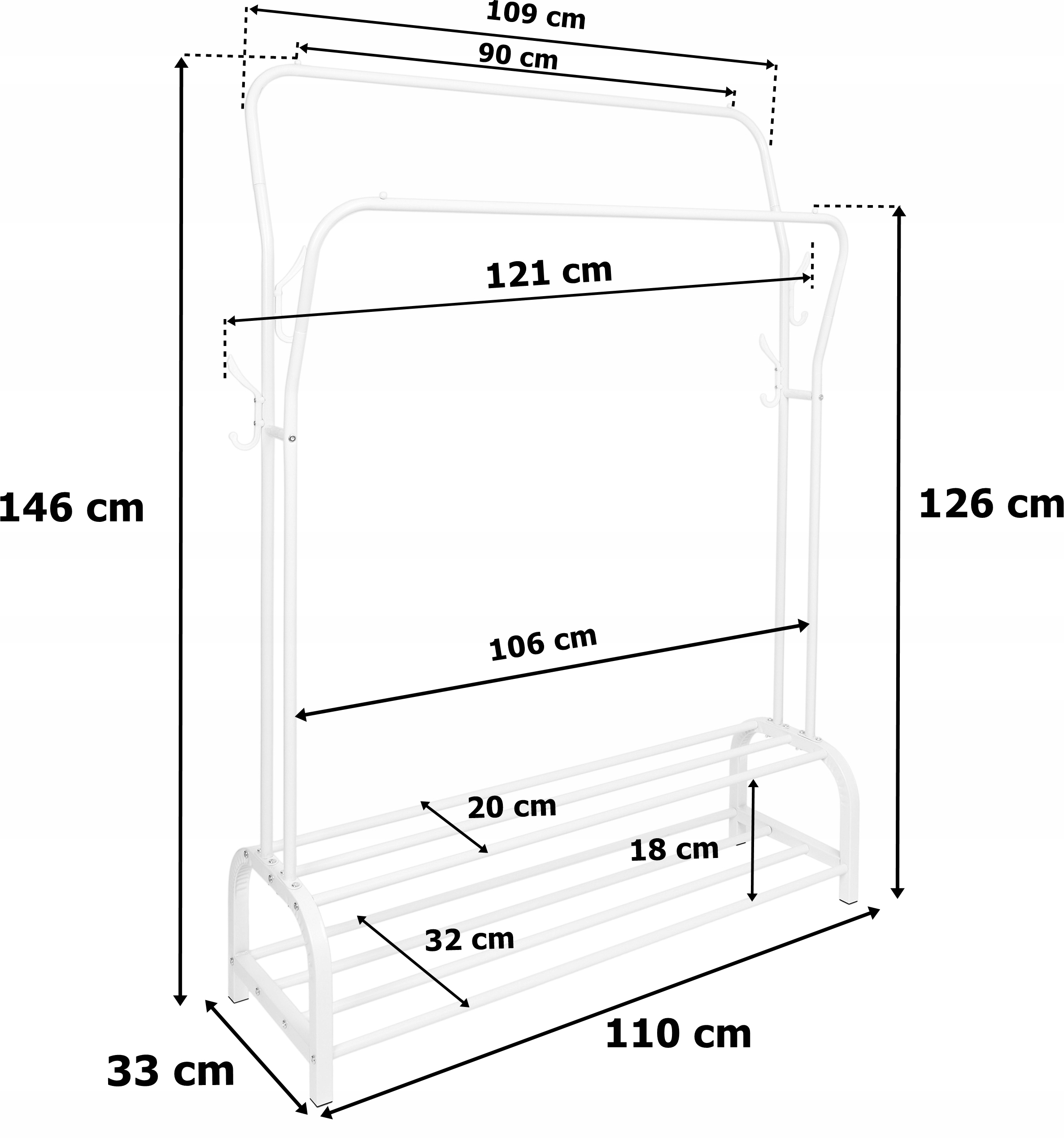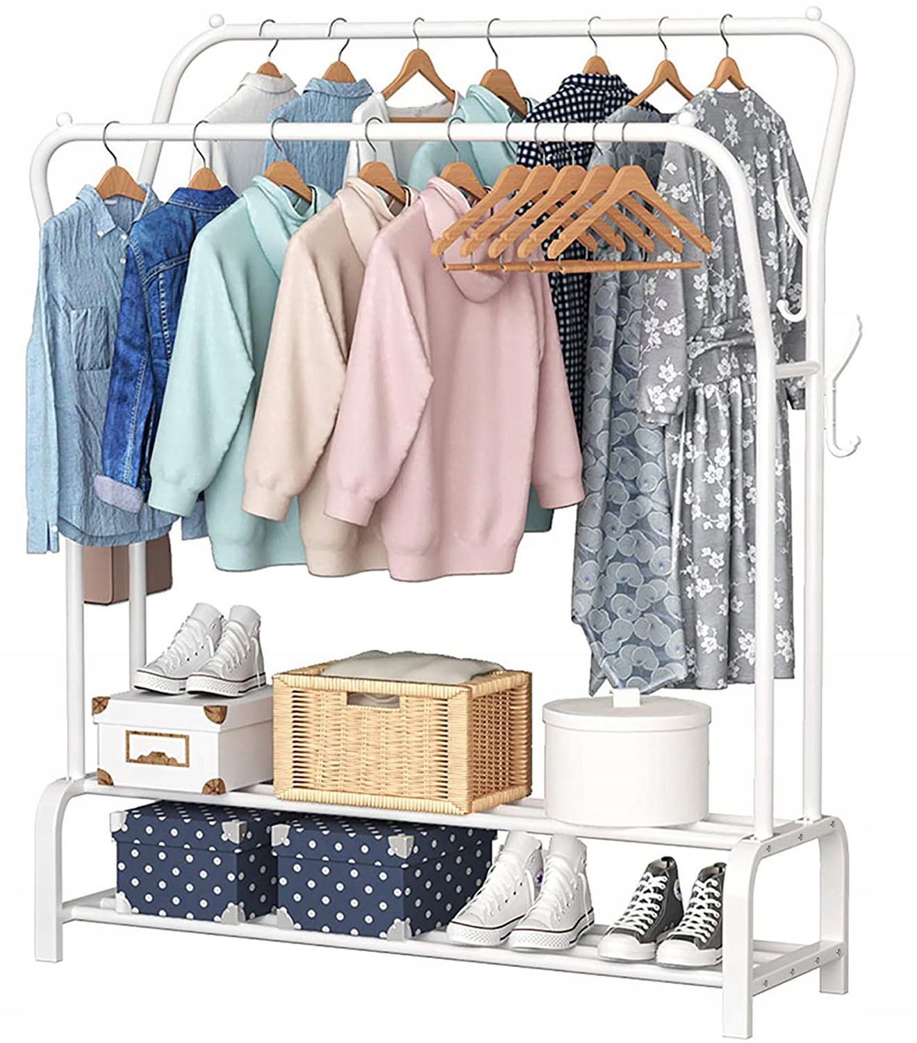 Lary - это двойная вешалка для гардероба с дополнительными крючками для аксессуаров. Большая вместимость гарантирует подвешивание большого количества одежды и аксессуаров. Дополнительный нижний полки без проблем поместят несколько пар обуви и хранят самые необходимые вещи. Вешалка изготовлен из стальных трубок с порошковым покрытием белого цвета. Стальная конструкция обеспечивает стабильность, вам не нужно беспокоиться о опрокидывании вешалки при большой нагрузке. Два горизонтальные основные трубки имеют блокировки от скольжения одежды. В процессе производства используется материалы самого высокого качества, сохраняя внимание к мельчайшим деталям. Модель прочный, практичный и многофункциональный. С его помощью вы сможете разместить много одежды и аксессуаров, экономя при этом пространство.