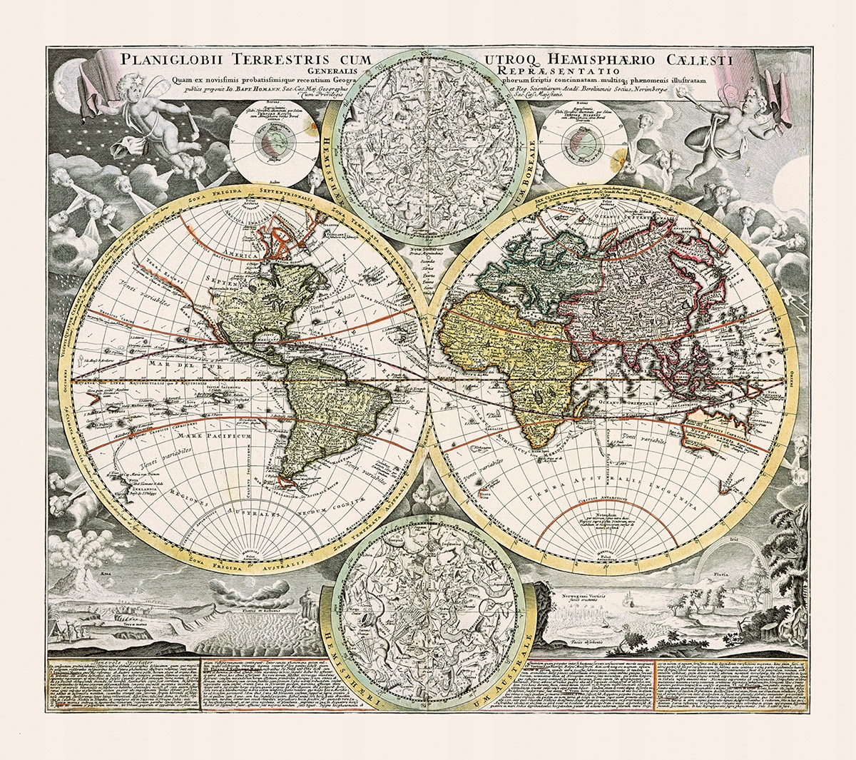 Unikalna reprodukcja mapy Świata (Planiglobii Terrestris Cum Utroq[ue] Hemisphario Calesti Generalis Exhibitio) autorstwa Johann Baptist Homann z roku ok 1715 w rozmiarze 50x40cm. Możliwy dowolny wymiar do 1,1m po krótszym boku na indywidualne zamówienie.