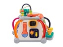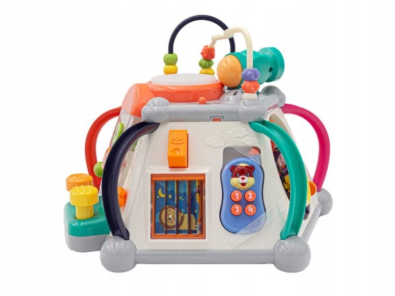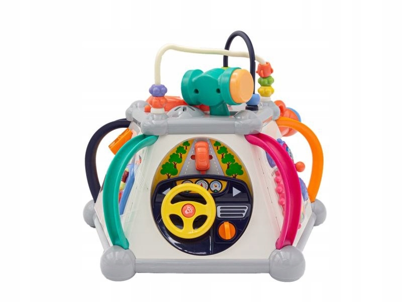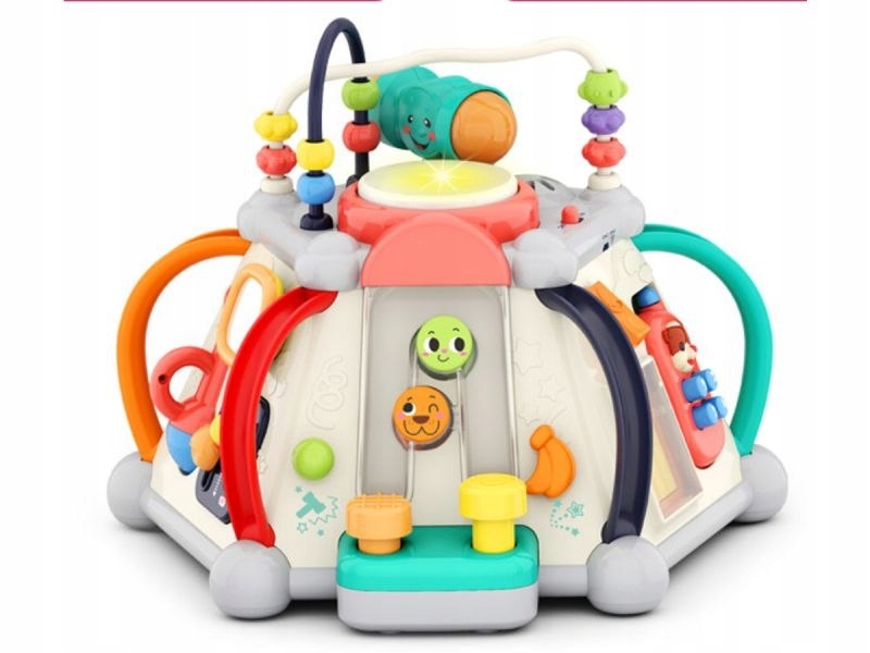 На верхней стене есть два лабиринта-очереди с разноцветными бусинами и большая кнопка, которая при нажатии он загорается и издает несколько звуков. Здесь также есть переключатель вкл/выкл и место для молотка используется для аркадной игры. Бисер может выполнять множество функций, в зависимости от возраста ребенка - малышам будет очень весело прикасаться к ним и переворачивать повязку на голову, в свою очередь, дети постаршес помощью бусин можно научить различать цвета,а затем считать.