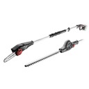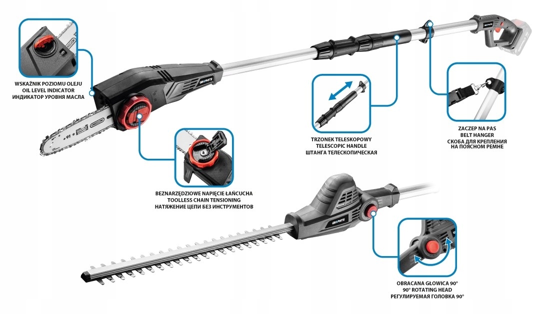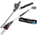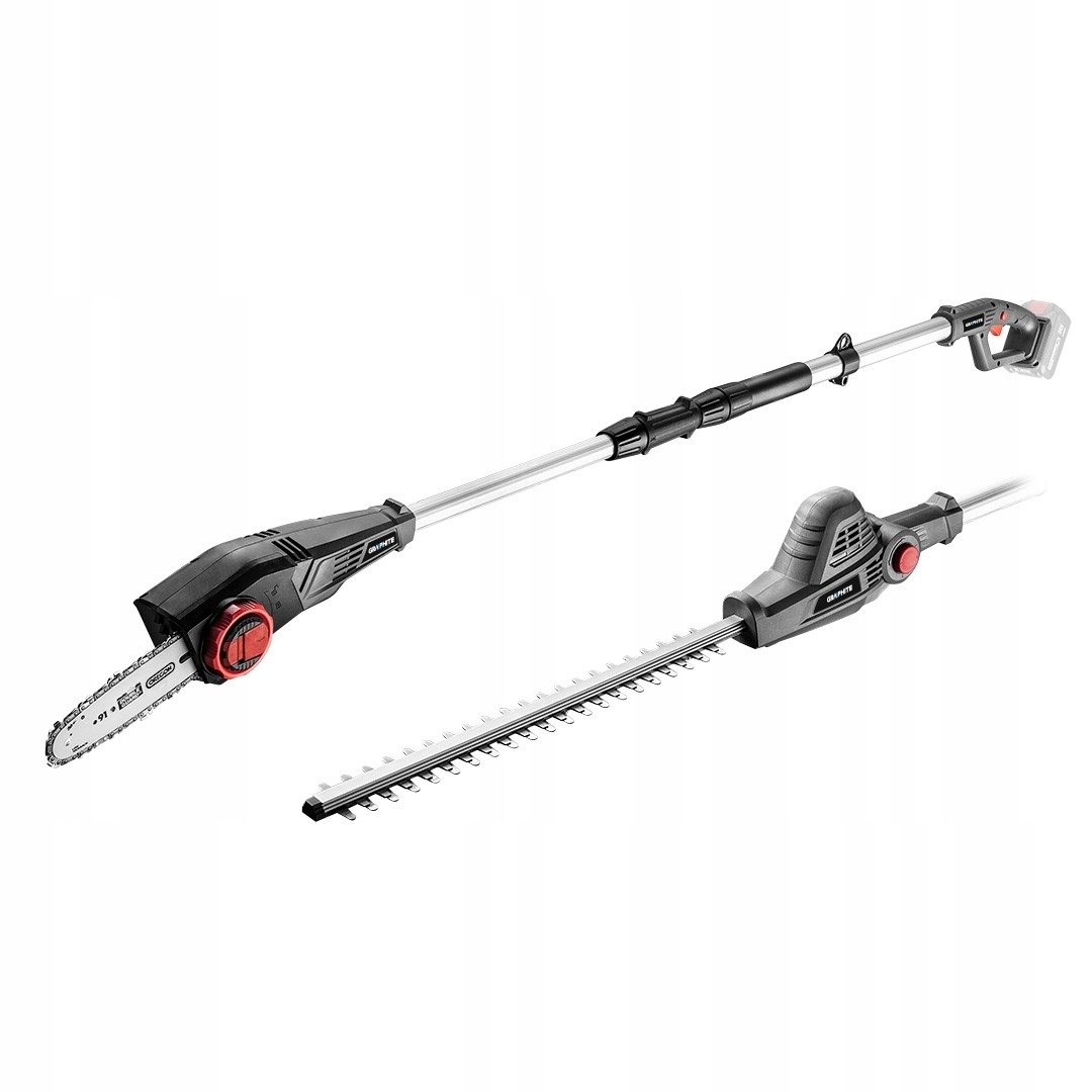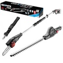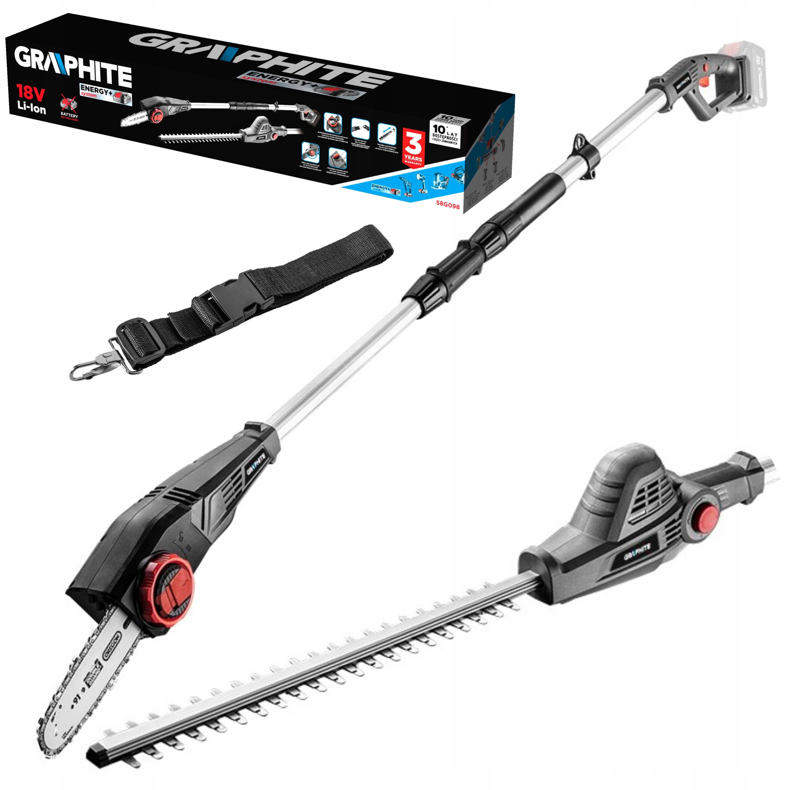 Urządzenie ogrodowe na wysięgniku 2w1 - pilarka i nożyce do żywopłotu Energy+ 18V, bez akumulatora 58G098 GRAPHITE to imponujące narzędzie składające się na pilarkę łańcuchową oraz nożyce do żywopłotu, umiejscowione na niemal 2-metrowym wysięgniku. Urządzenie należy do serii Energy+ marki GRAPHITE – nowoczesnego sprzętu, funkcjonującego w oparciu o wytrzymałe akumulatory o dużych pojemnościach. Ten model jest kompatybilny z akumulatorem litowo-jonowym 18 V DC Energy+ (brak w zestawie).