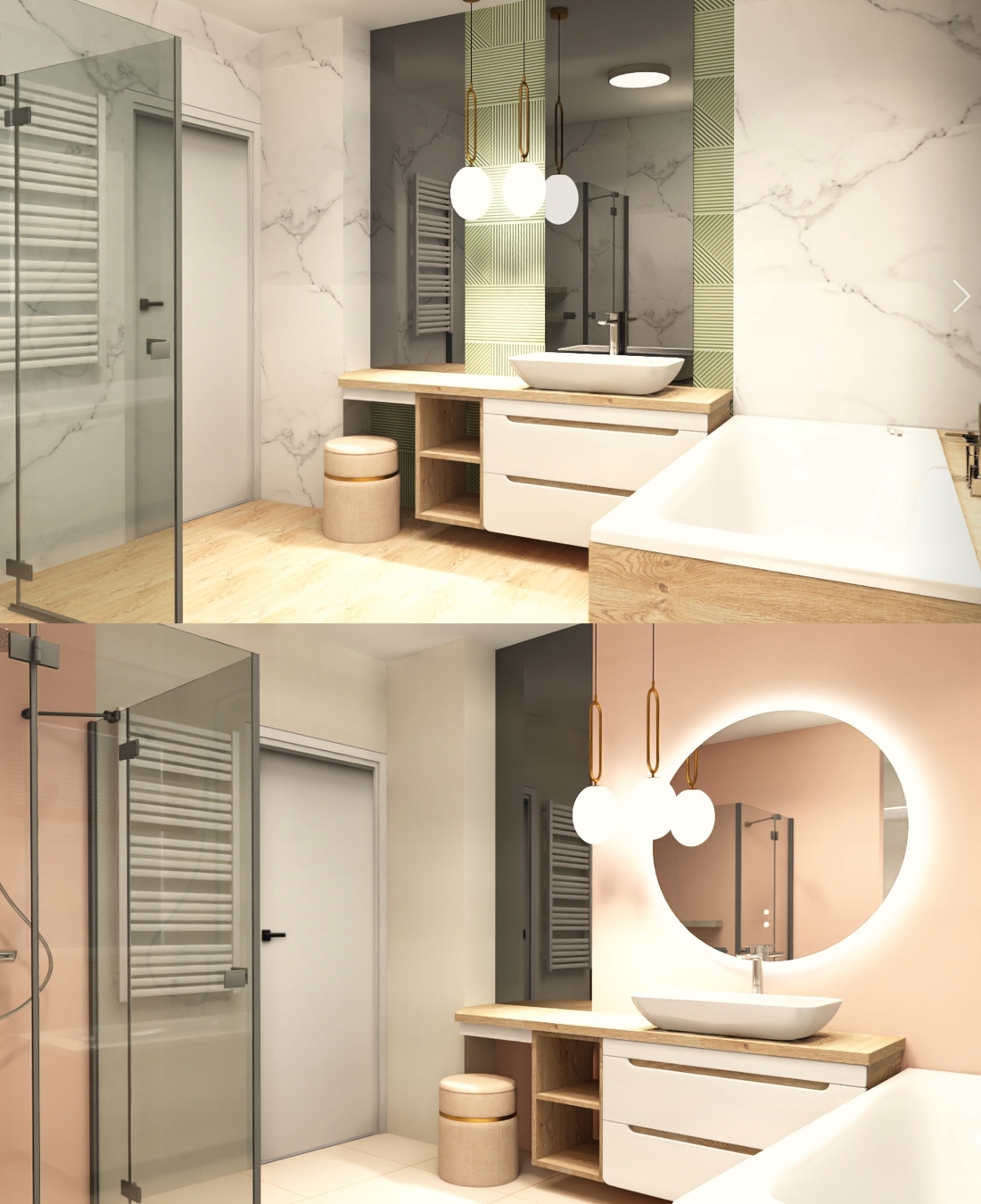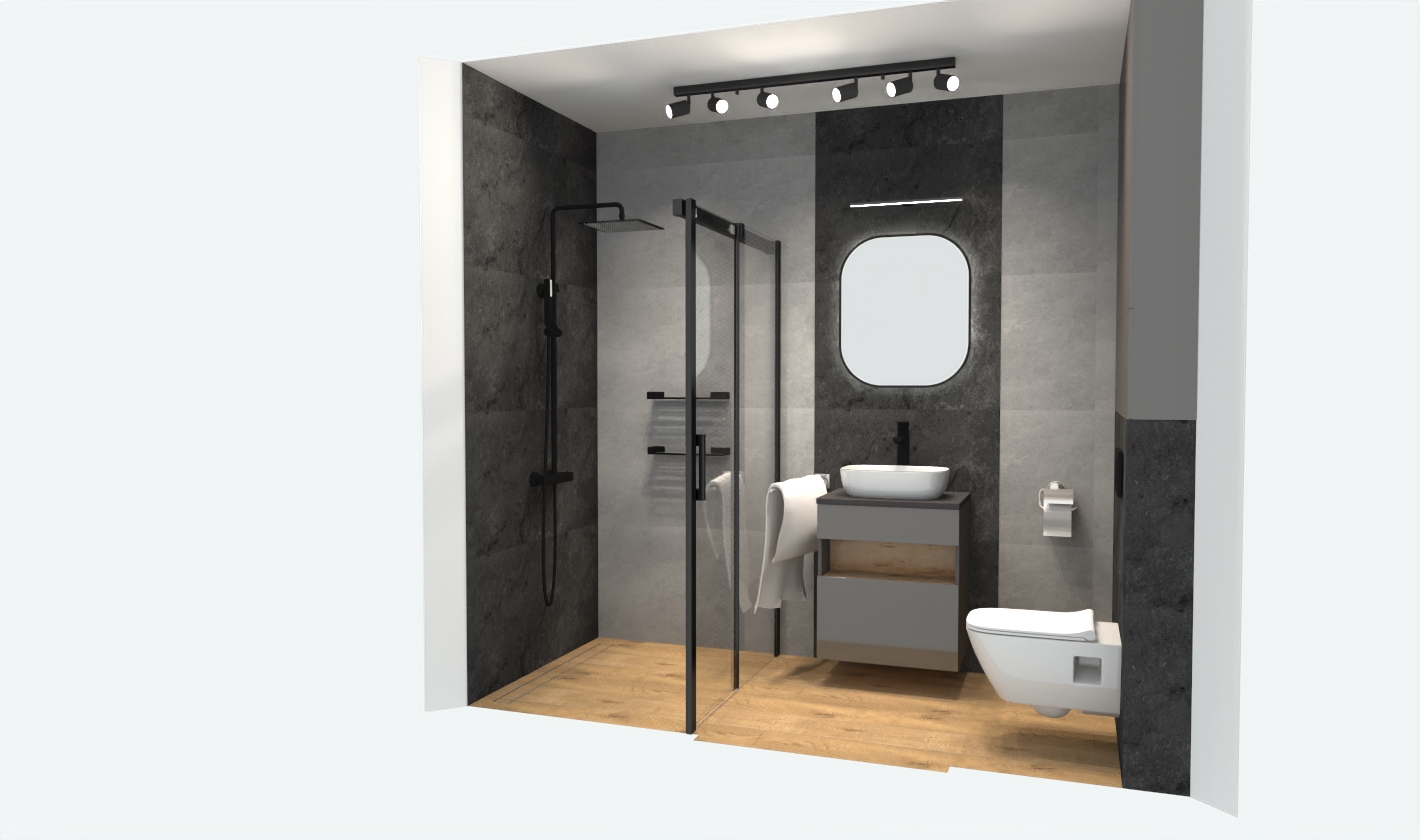 - projekt łazienki w formie komputerowych wizualizacji 3D wysokiej jakości w 5 różnych wersjach (np. różne kolekcje płytek i ich układów, różne ustawienie sanitariatów, różne wersje oświetlenia)
