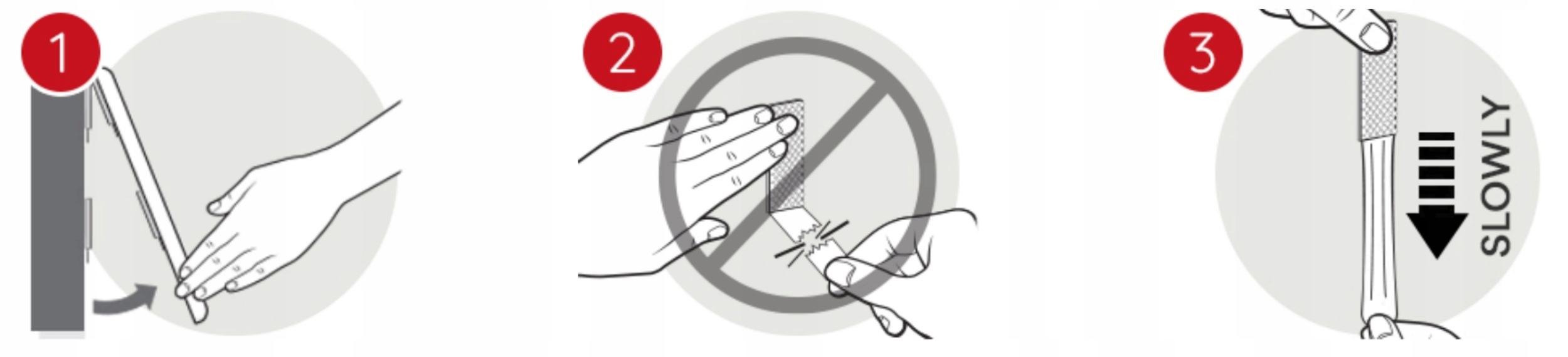 2. Pamiętaj, żeby nigdy nie ciągnąć pasków do siebie, ani nie odklejać ich od ściany. Zawsze ciągnij w dół, najwolniej, jak to możliwe.