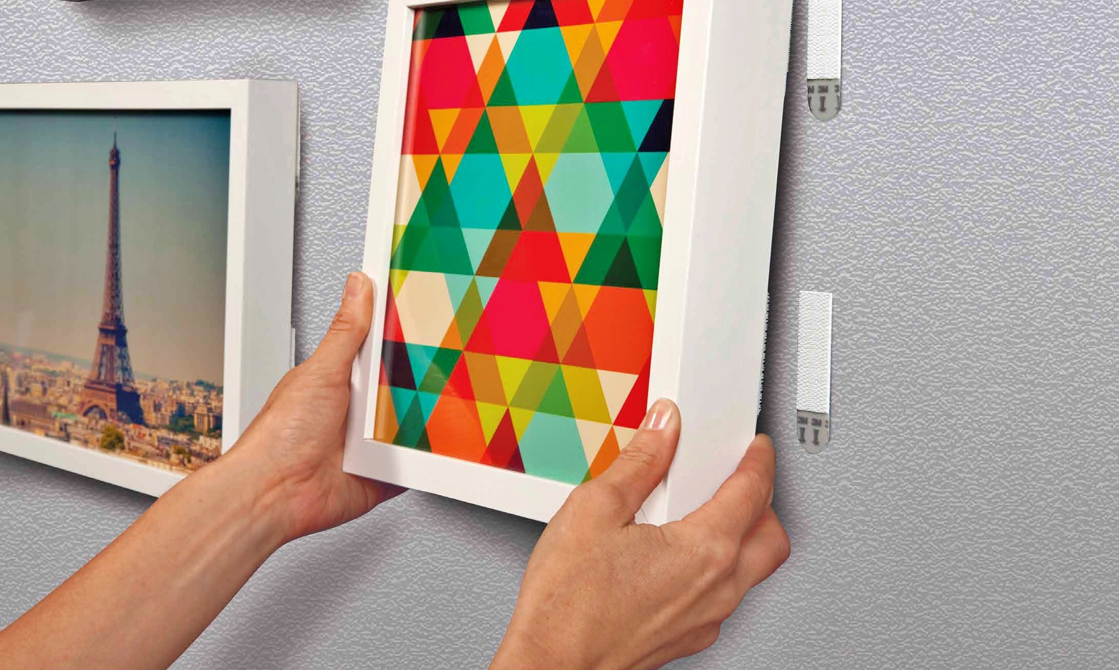 jest całkowicie schowany pod obrazem, pozwala eksperymentować z aranżacją, nie robiąc dziur przy zawieszaniu, i nie niszcząc powierzchni przy odklejaniu.