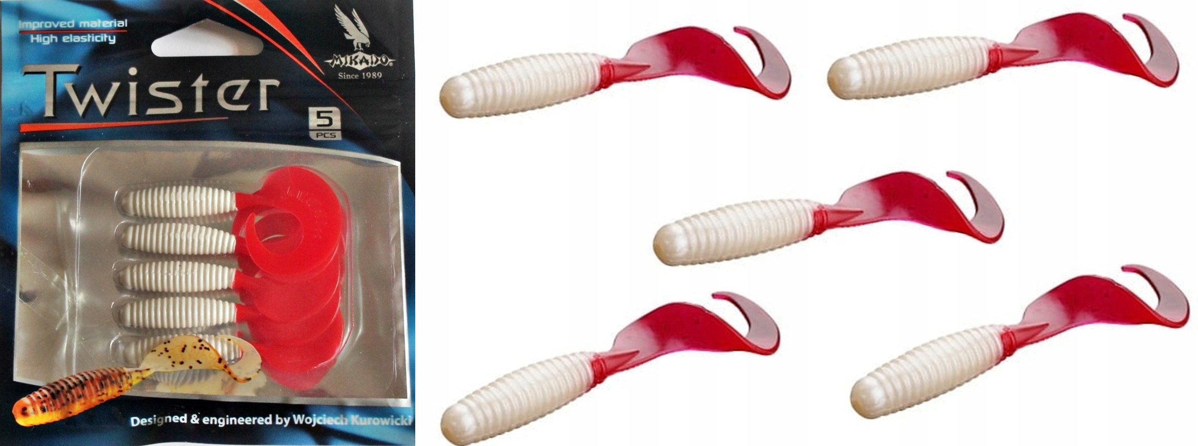 TWISTERY MIKADO WYKONANE Z WYJĄTKOWO MOCNEGO TWORZYWA O SPECJALNIE PRZECIĄŻONYM , KARBOWANYM KORPUSIE ORAZ POWIĘKSZONEJ POWIERZCHNI OGONKA. NAPRĘŻENIA JAKIE POWSTAJĄ POMIĘDZY PRZECIĄŻONYM KORPUSEM A BARDZO DUŻYM OGONKIEM POWODUJĄ GENEROWANIE NIEZWYKLE SILNEJ FALI HYDROAKUSTYCZNEJ WYTWARZANEJ PRZEZ WIBRACJE OGONKA. FALA TA NAKŁADA SIĘ NA ZAWIROWANIA WODY OPŁYWAJĄCEJ GŁĘBOKIE , POPRZECZNE KARBY KORPUSU.