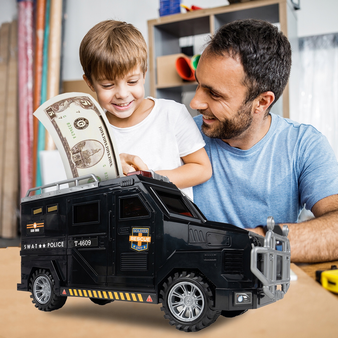 Оригинальная форма бронированного автомобиля он может понравиться детям, и не только приучить их к идее экономии, но и веселиться.