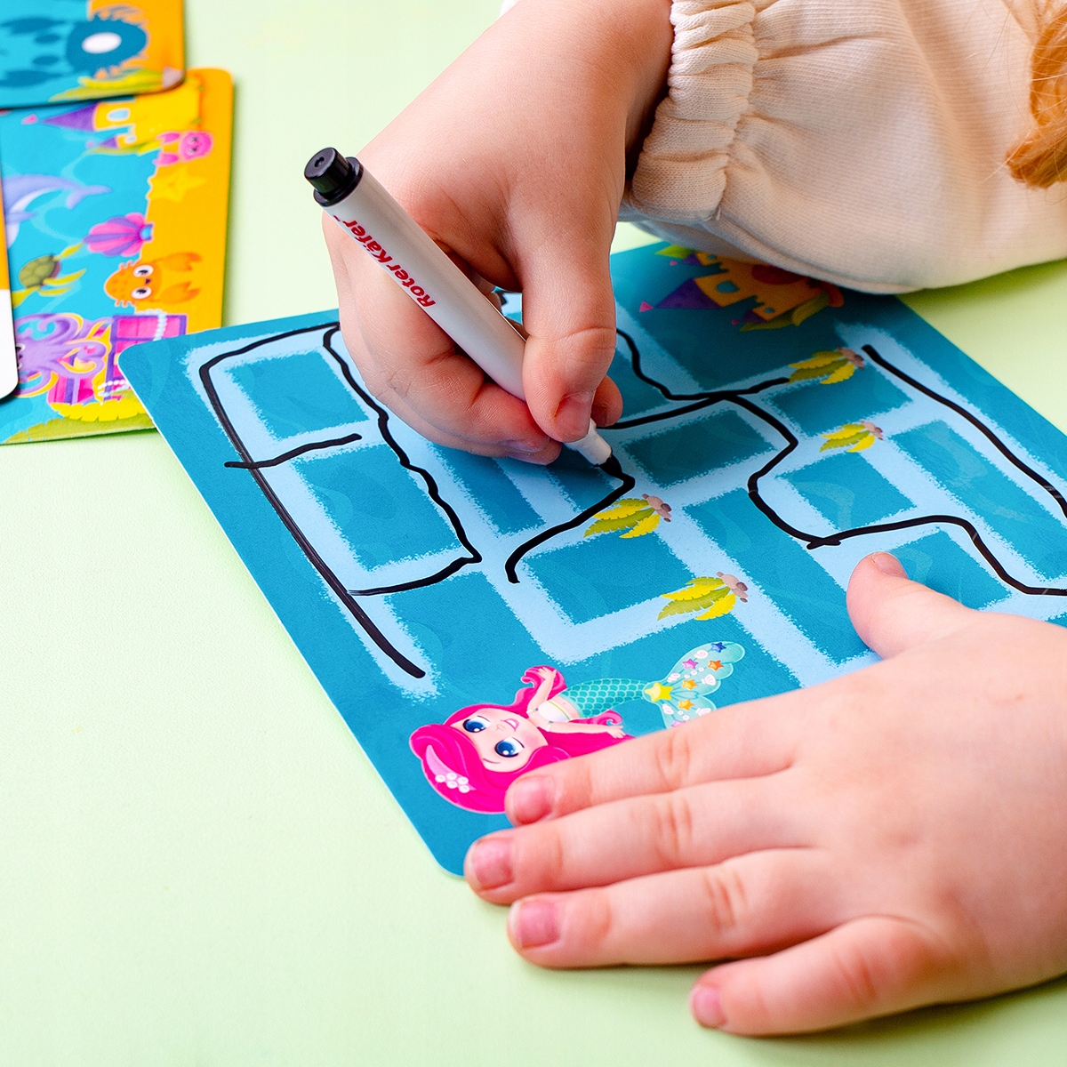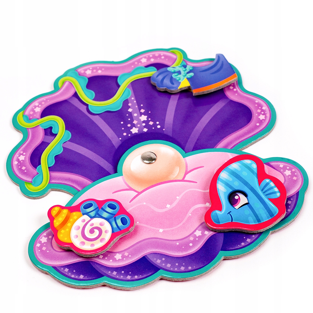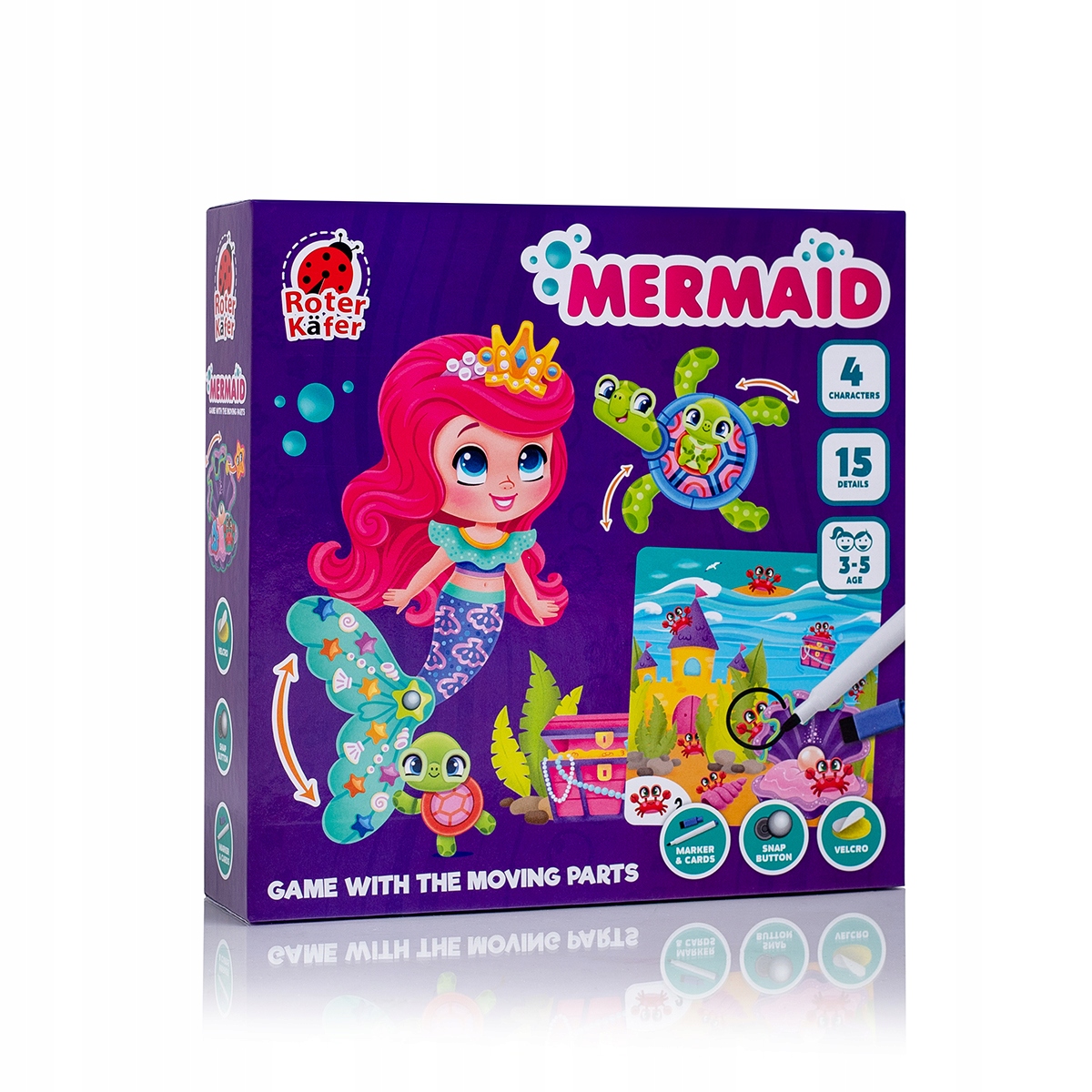 "Poznaj syrenę i jej przyjaciół! Graj i odkrywaj podwodny świat i jego mieszkańców. Zestaw zawiera plansze do gry z ruchomymi elementami i dodatkowe detale. Zamocuj te elementy za pomocą rzepów. Przykład: wybierz wizerunek syrenki i dołącz elementy garderoby wraz z akcesoriami. Rusz ogona! Wykonuj także zadania na kartach specjalnym pisakiem ścieralnym. Gra rozwija wyobraźnię, logiczne myślenie, pamięć oraz umiejętności motoryczne.