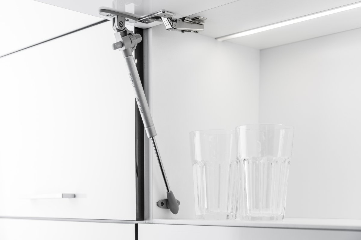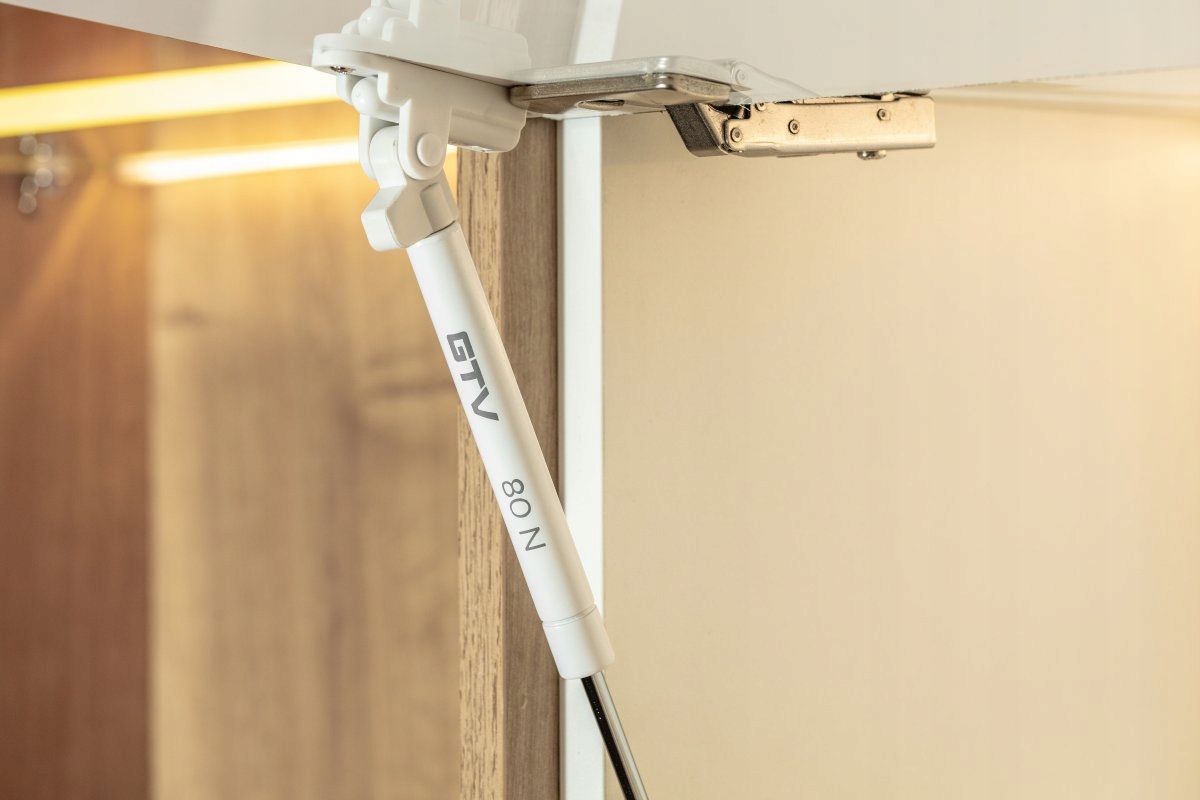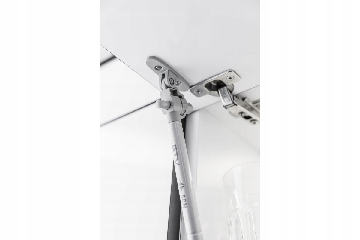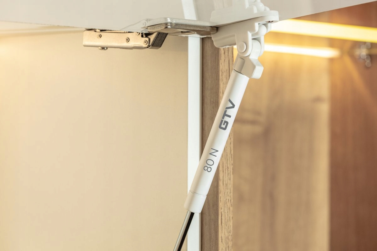 Podnośnik gazowy PD-GAM-080-N60 posiada amortyzator zapewniający cichy domyk szafek oraz zawiera regulację wysunięcia amortyzatora.