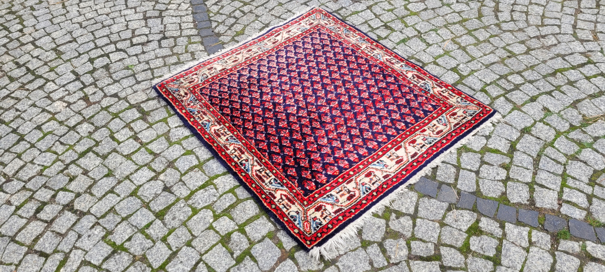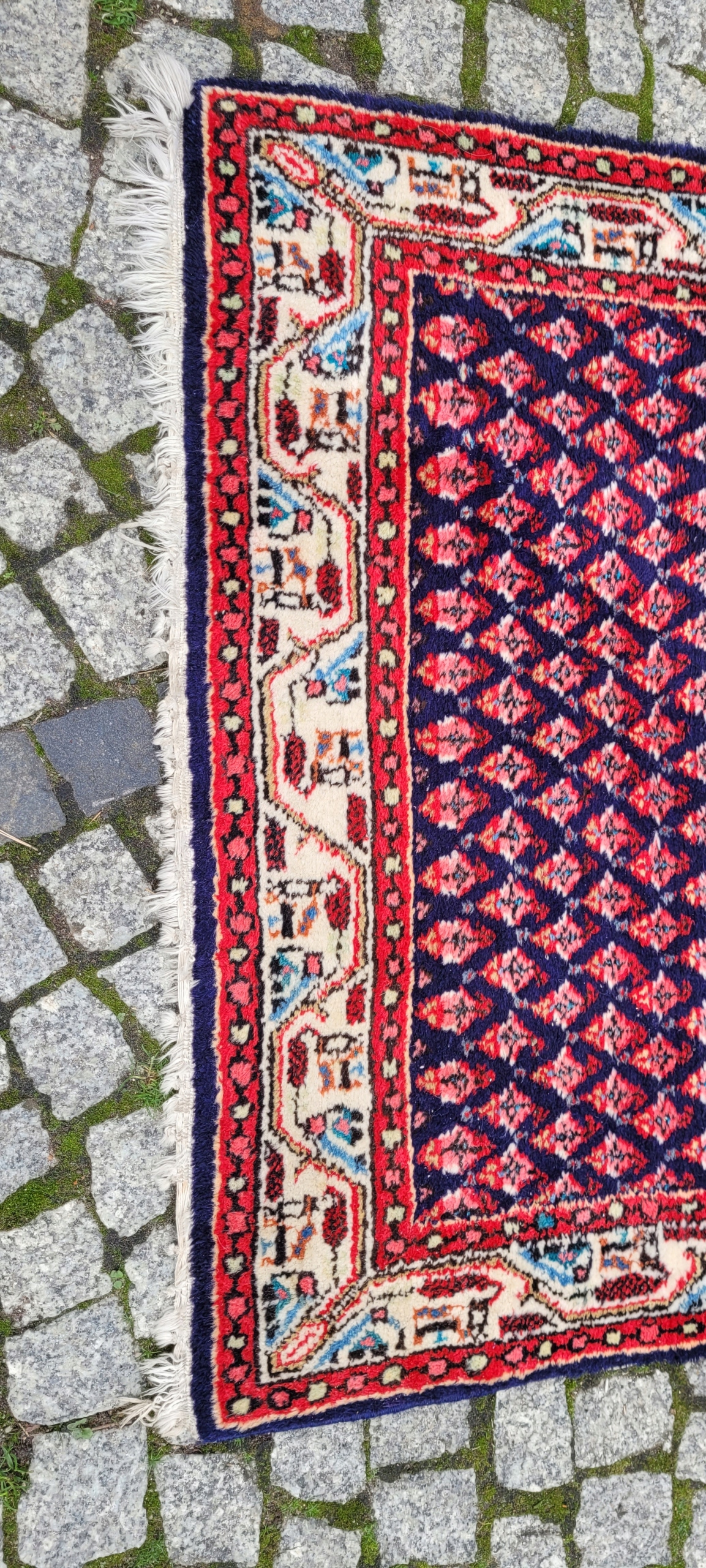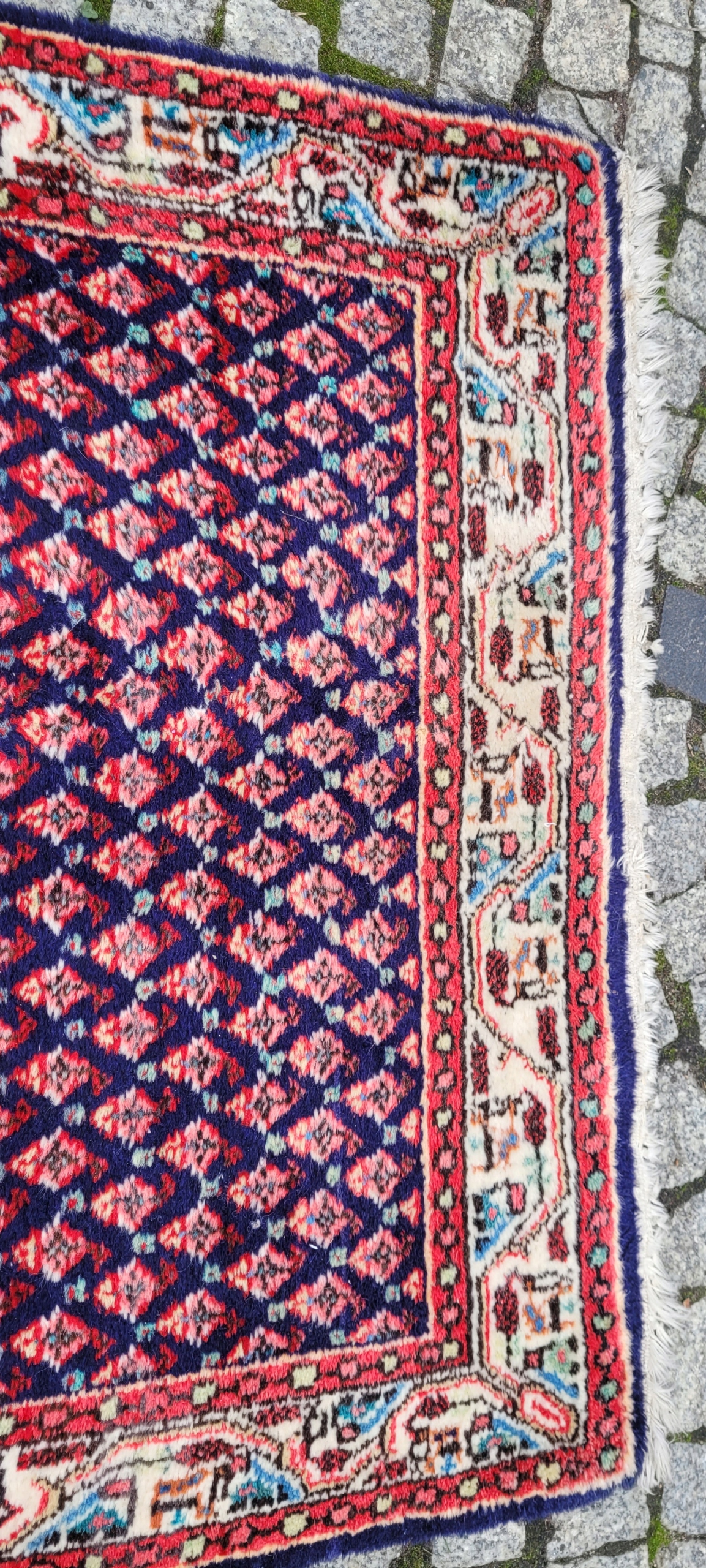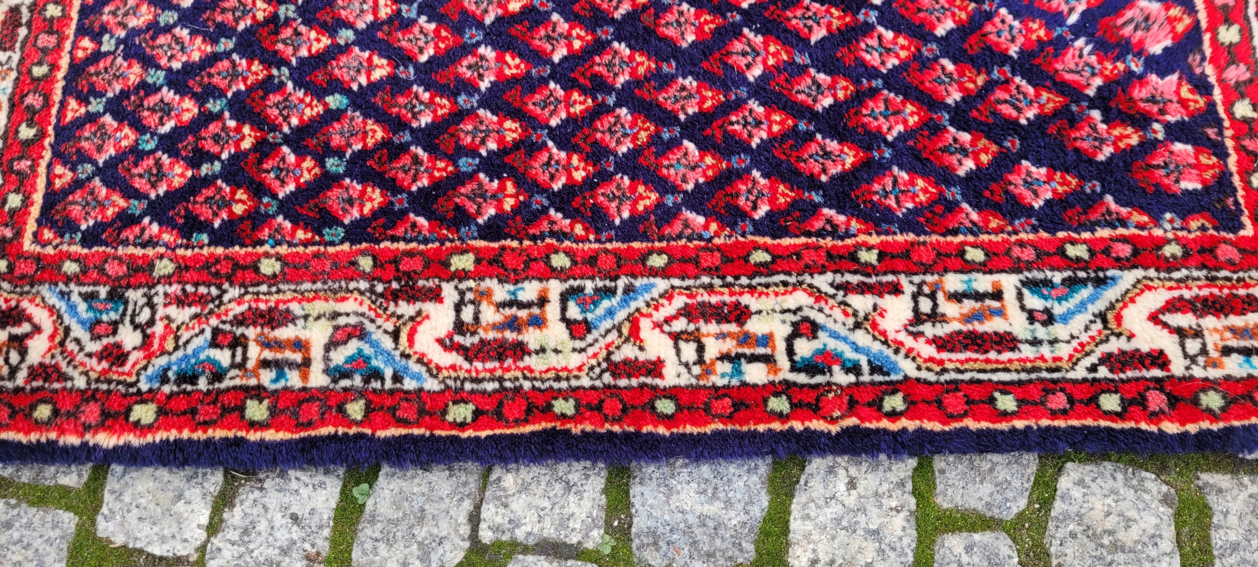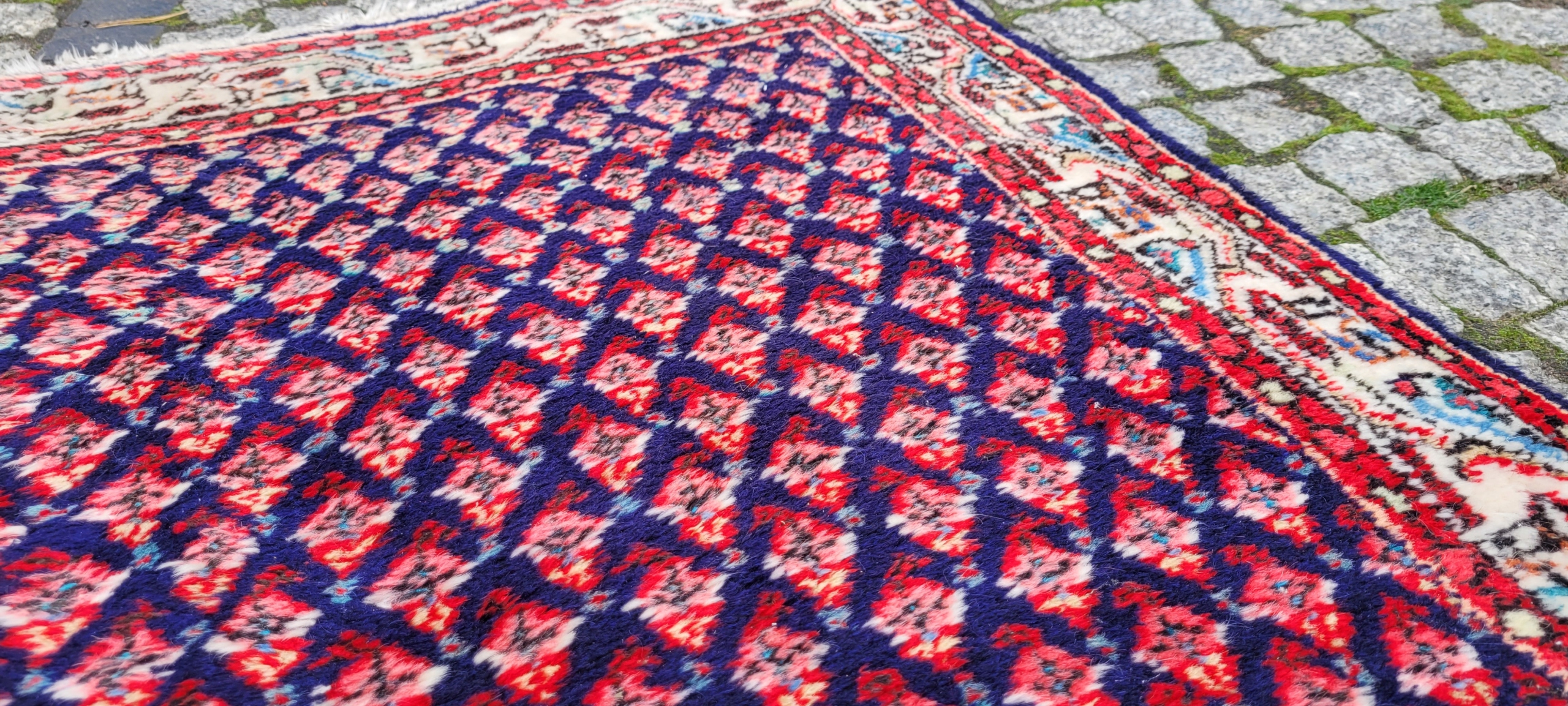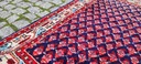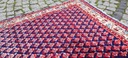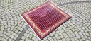 Perski dywan Saroug. Tkany ręcznie z najwyższej jakości wełny. Charakteryzuje się zwartym, przyjemnym w dotyku, lśniącym runem oraz piękną kolorystyką i wzornictwem. Jest zachowany w stanie dobrym, widocznym na zdjęciach.