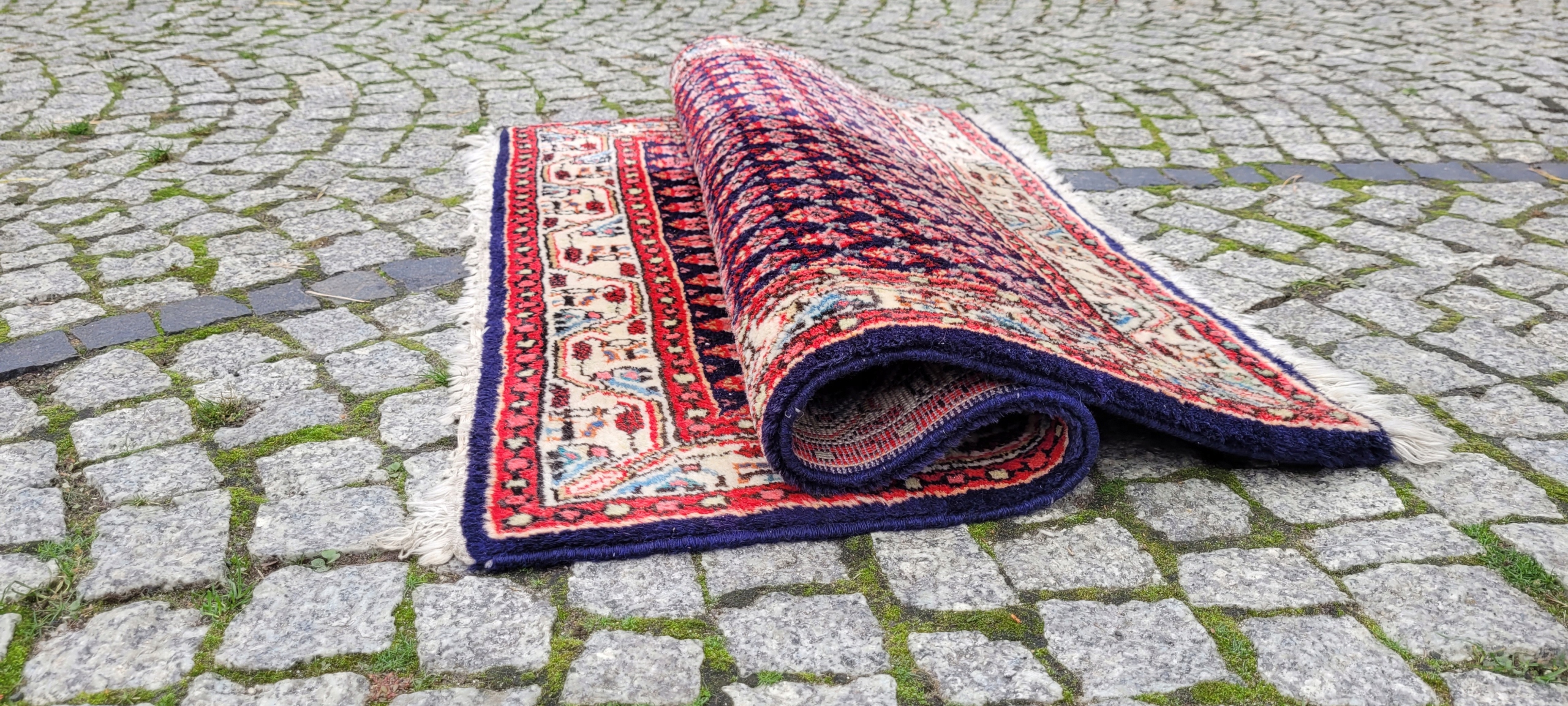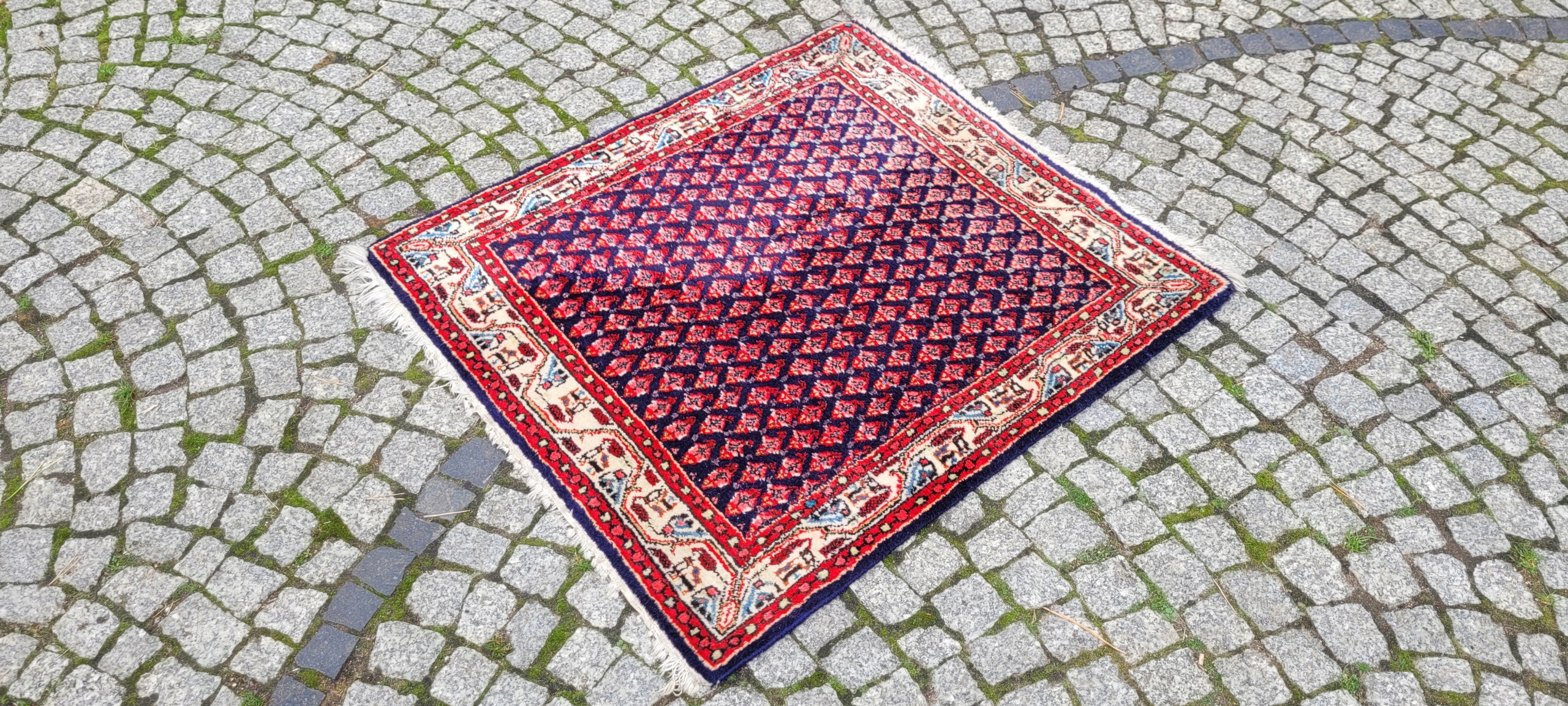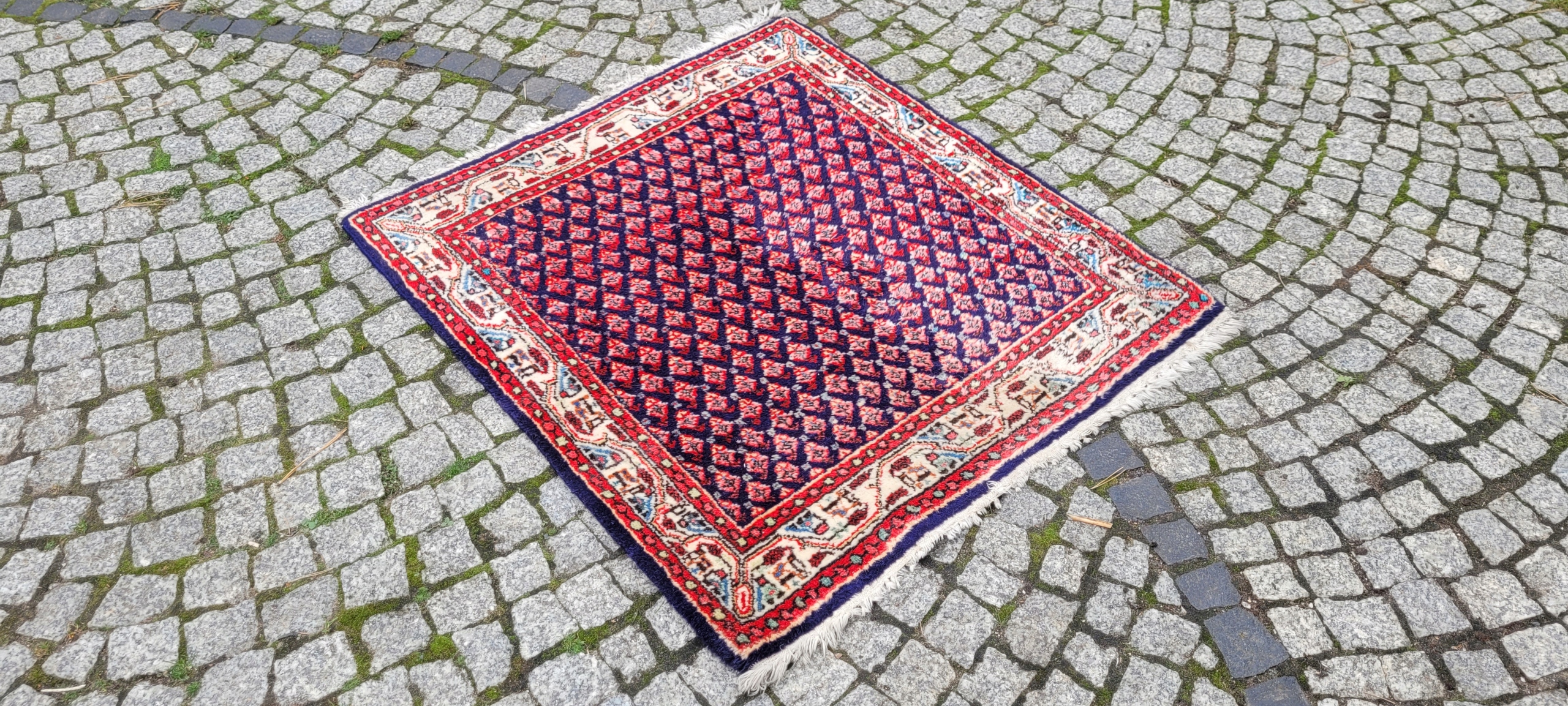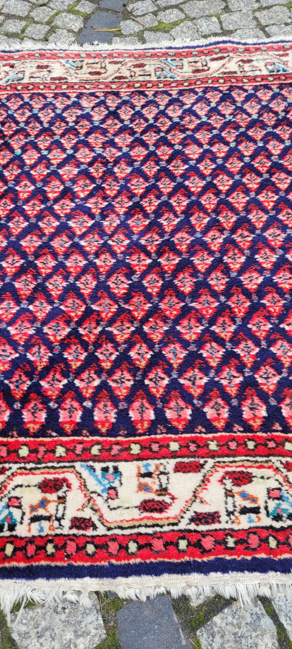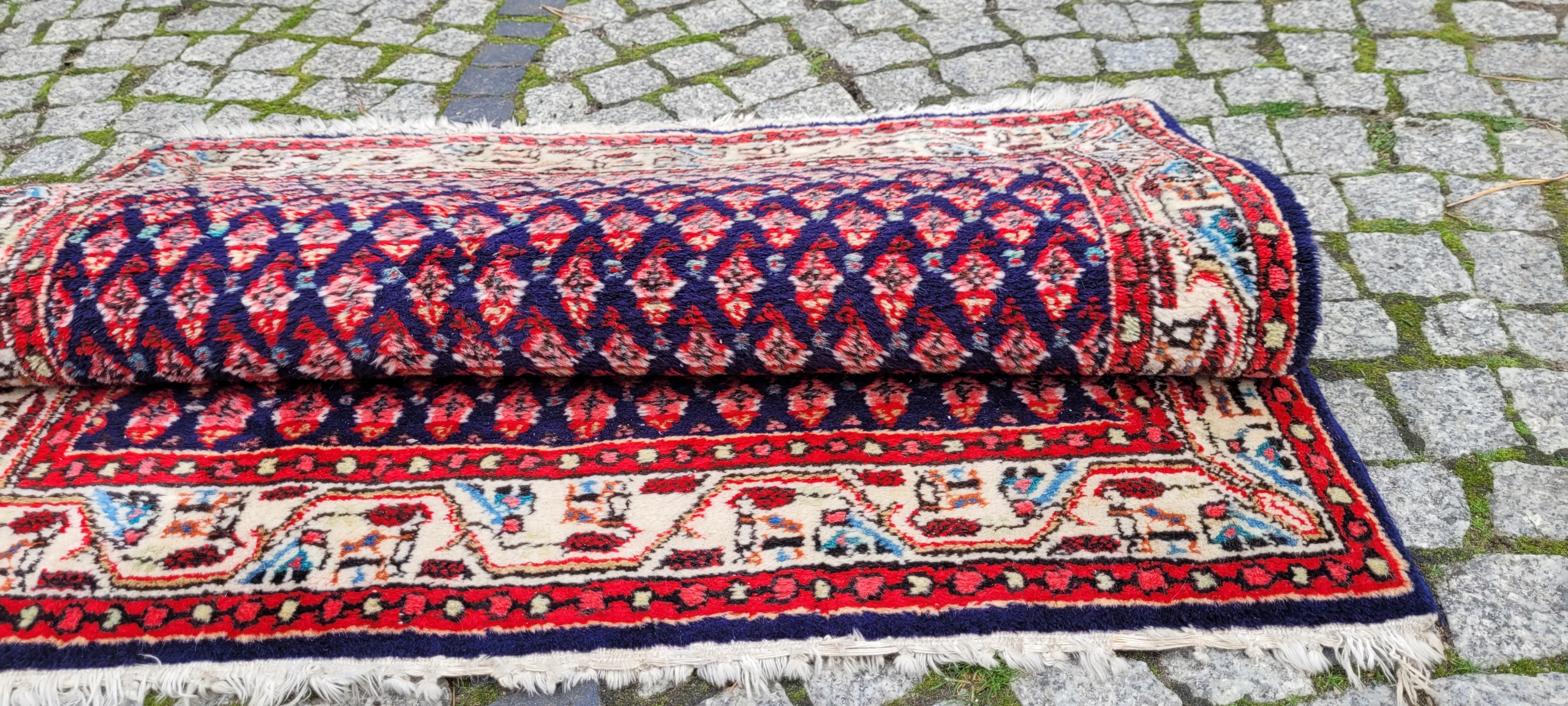 Perski dywan Saroug. Tkany ręcznie z najwyższej jakości wełny. Charakteryzuje się zwartym, przyjemnym w dotyku, lśniącym runem oraz piękną kolorystyką i wzornictwem. Jest zachowany w stanie dobrym, widocznym na zdjęciach.