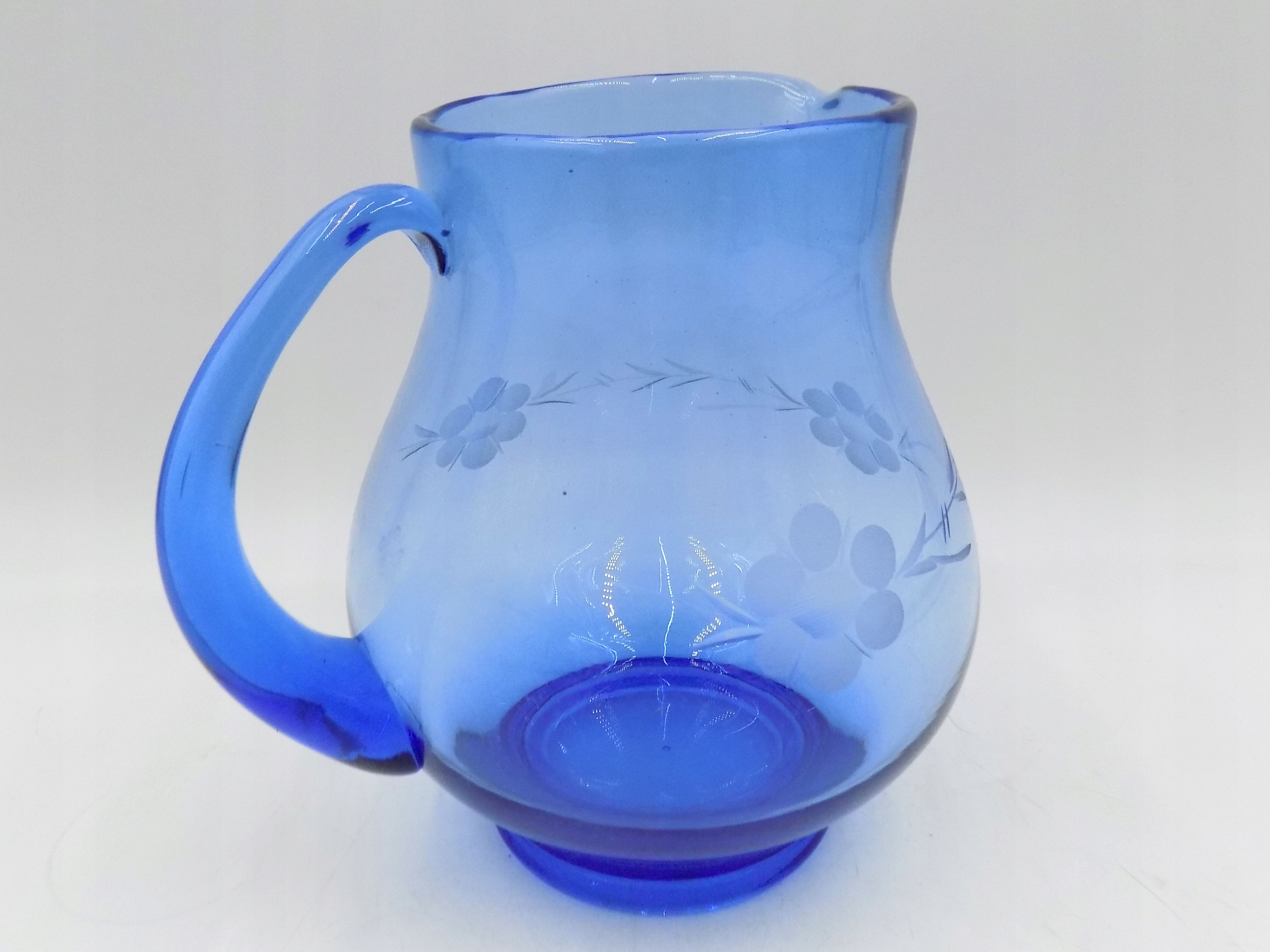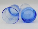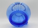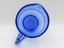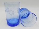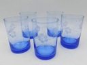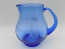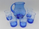 Zestaw do napojów z niebieskiego szkła. Komplet składający się z dzbanka i pięciu szklanek. Bulwiasty kształt dzbanka. Zdobienia przedstawiające kwiaty. Polska produkcja z drugiej połowy XX w. Wymiary; wys. dzbanek 17 x 17,5 x 14 cm; szklanka 10 x 6,5 cm. Ślady użytkowania.