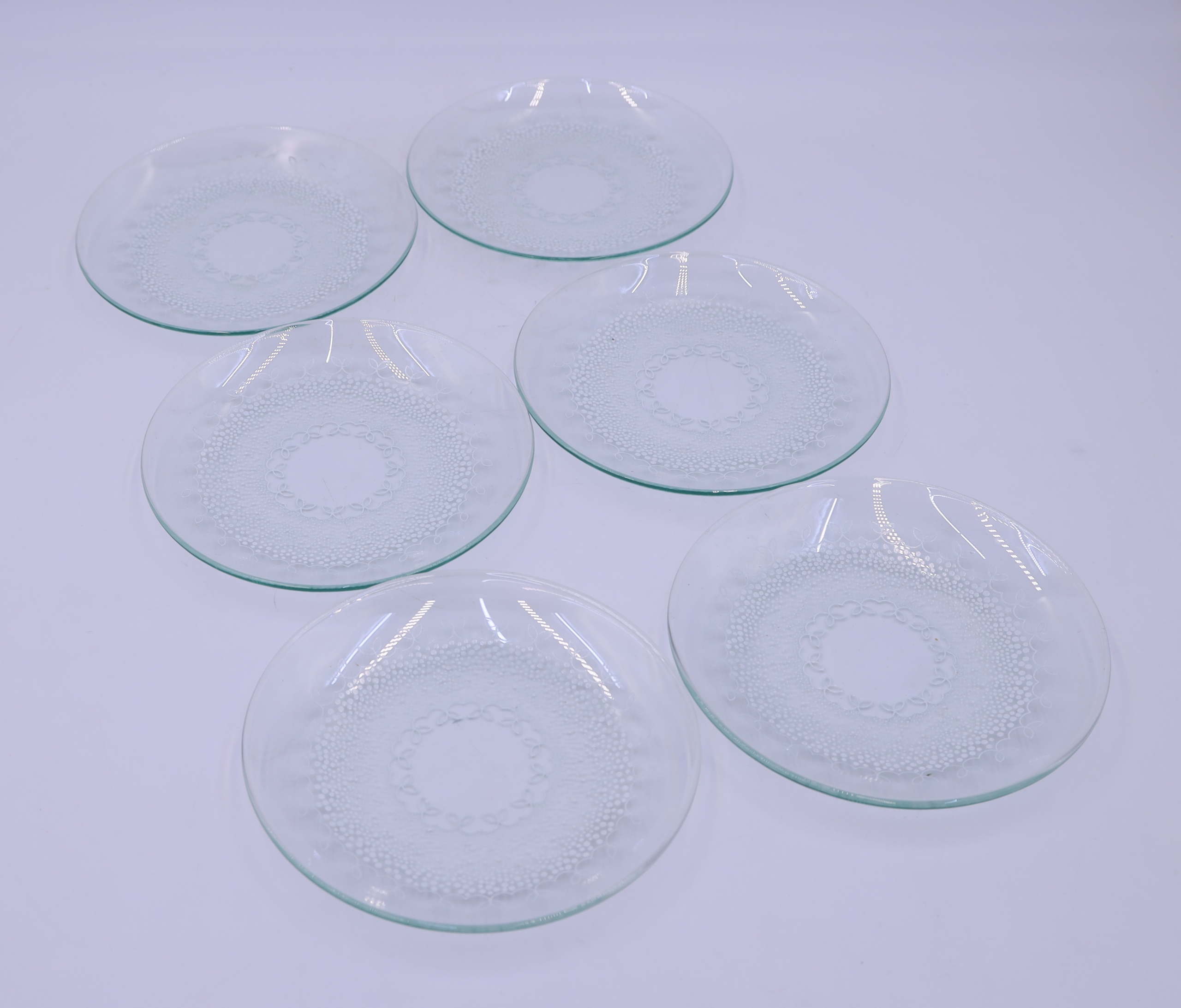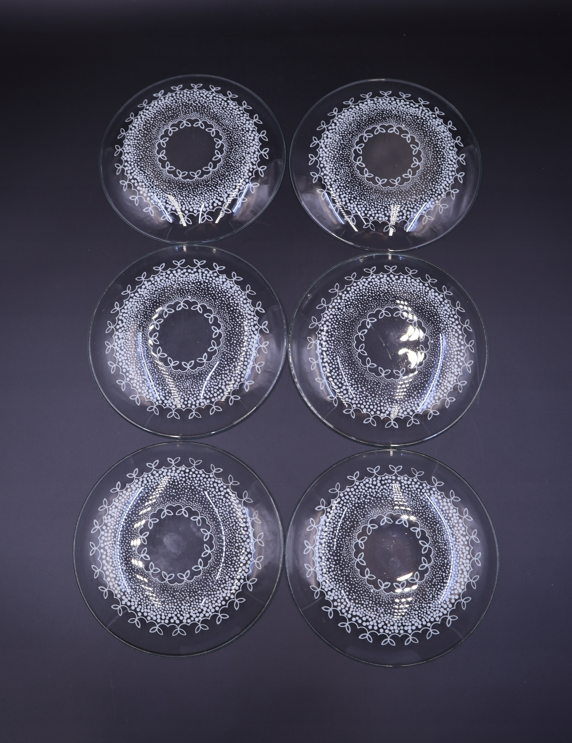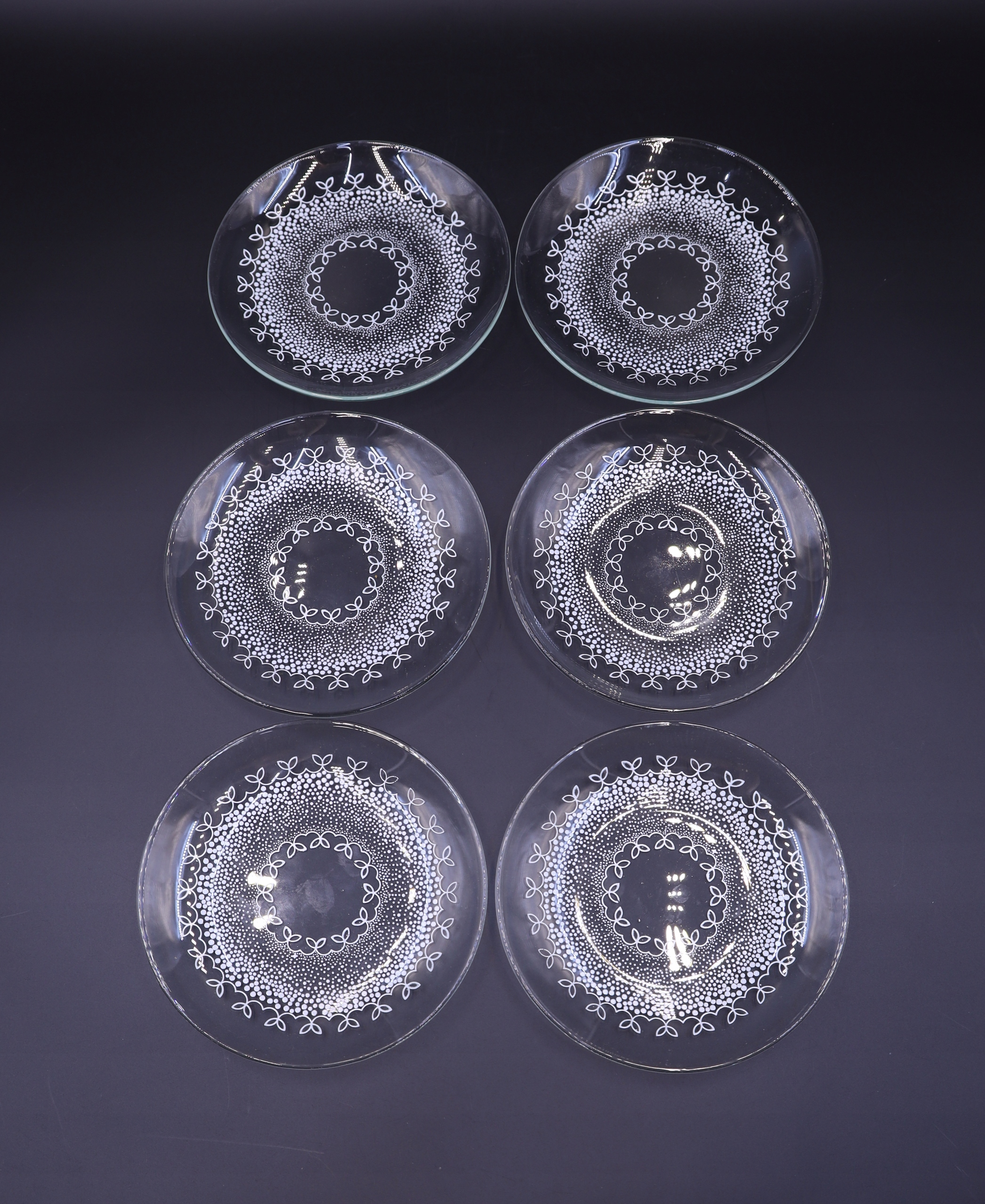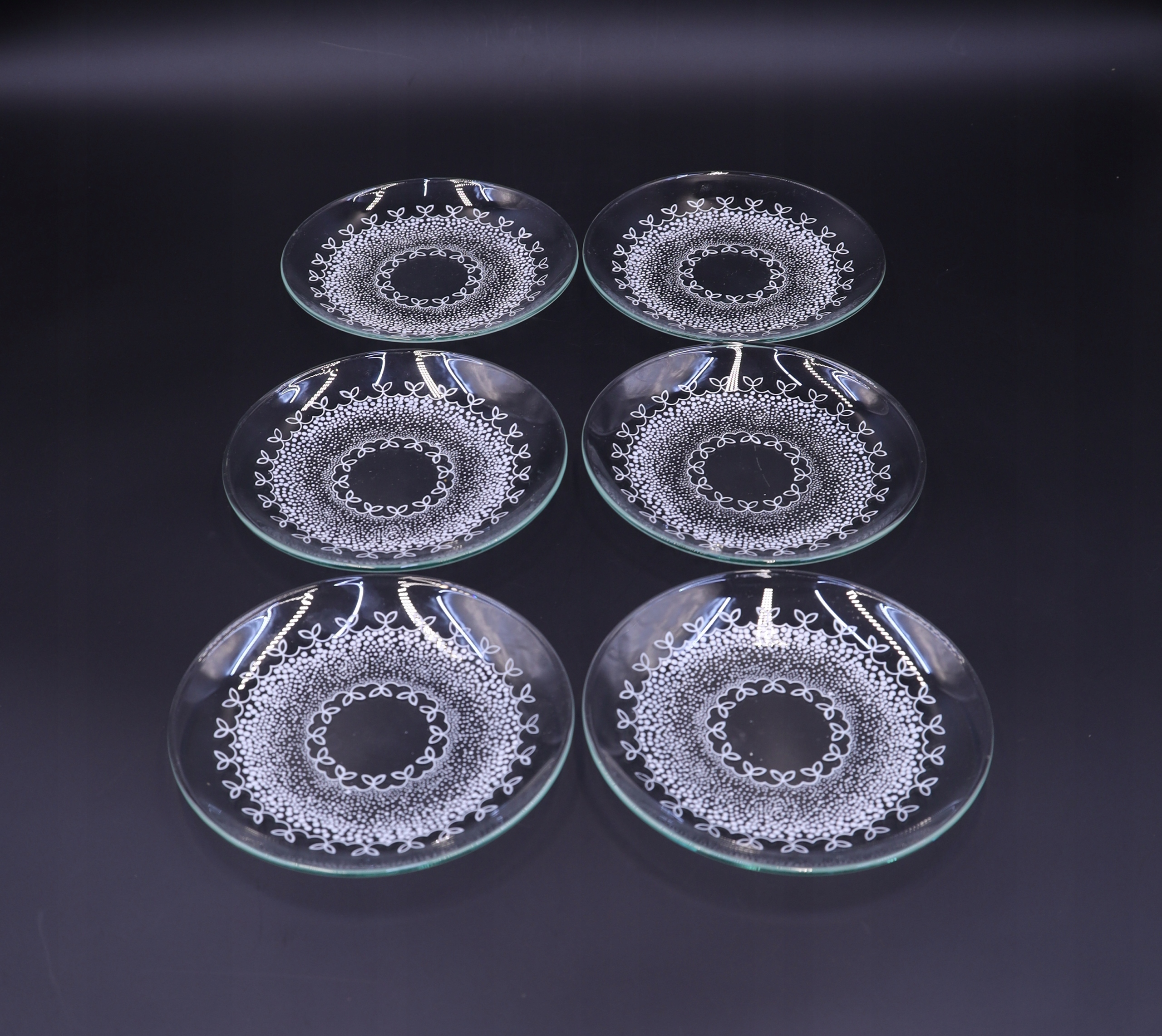 Набор из 6 стеклянных десертных тарелок периода PRL, вероятно, 60-х годов. Остатки использование. Размер: 15 см. Рекомендую коллекционерам