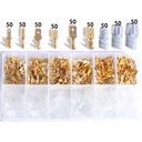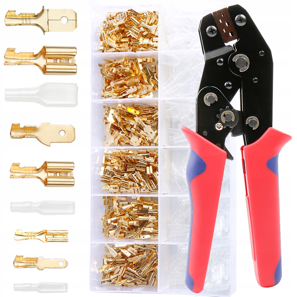 Złącza kablowe w solidnym plastikowym opakowaniu, posortowane według rozmiaru w oddzielnych przegródkach.