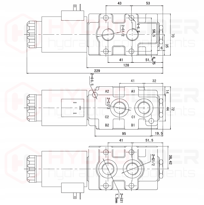 Z lewej strony schemat hydrauliczny rozdzielacza: