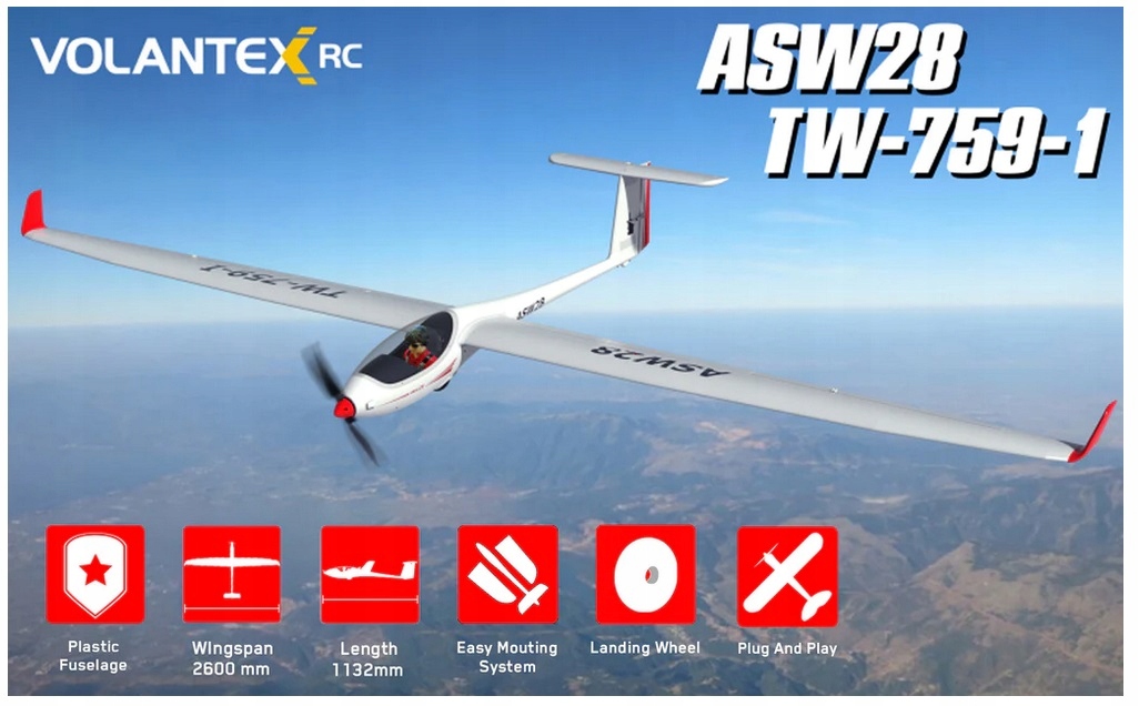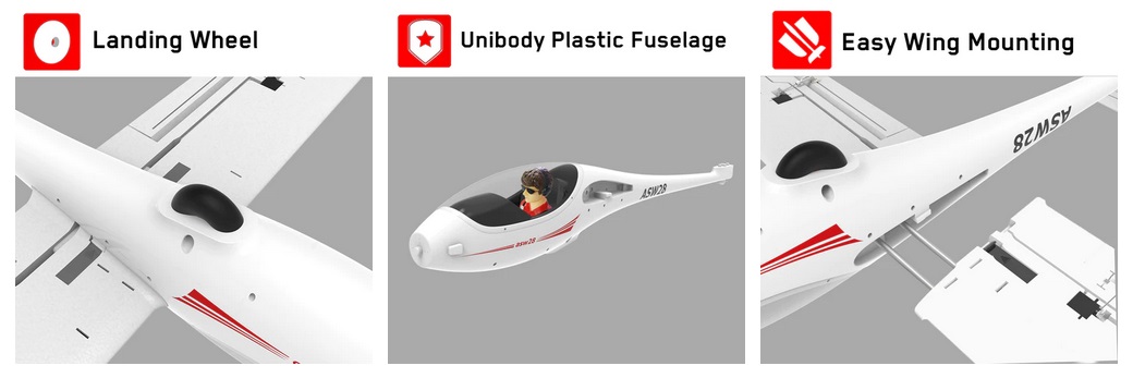 ASW28 V2 является улучшенной версией своего предшественника, крылья были улучшены дополнительный лонжерон для обеспечения дополнительной жесткости во время петель и поворотов легче установка, дополнительная пластиковая защелка гарантирует, что они останутся на месте. Кроме того, увеличена площадь фюзеляжа, что позволяет без проблем установить систему FPV если хочешь. Также было добавлено колесо для облегчения посадки. Модель очень проста в сборке и его сборка не требует много времени.