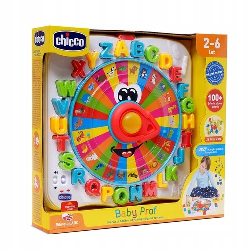 Baby Prof jest elektroniczną dwujęzyczną zabawką do wspierania dziecka w jego pierwszych próbach zabawy z użyciem alfabetu.