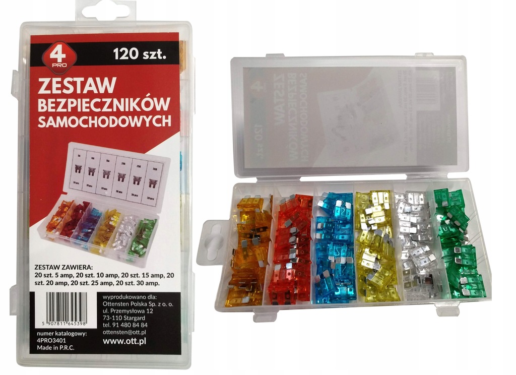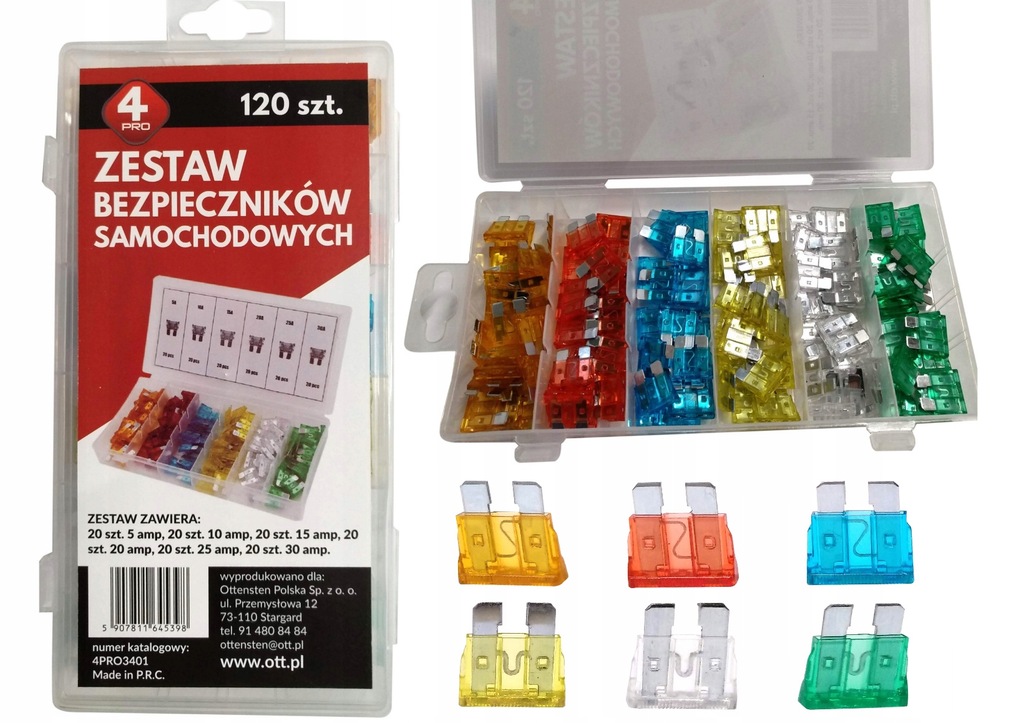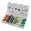Zestaw bezpieczników w zamykanym pudełku z przegródkami zawiera kolorowe bezpieczniki, uniwersalne o natężeniu prądu od 5 do 30A . Przeznaczone dla mechaników i elektryków w serwisach elektrycznych, elektronicznych, samochodowych itp. Bezpieczniki płytkowe posegregowane są w plastikowym sortowniku.