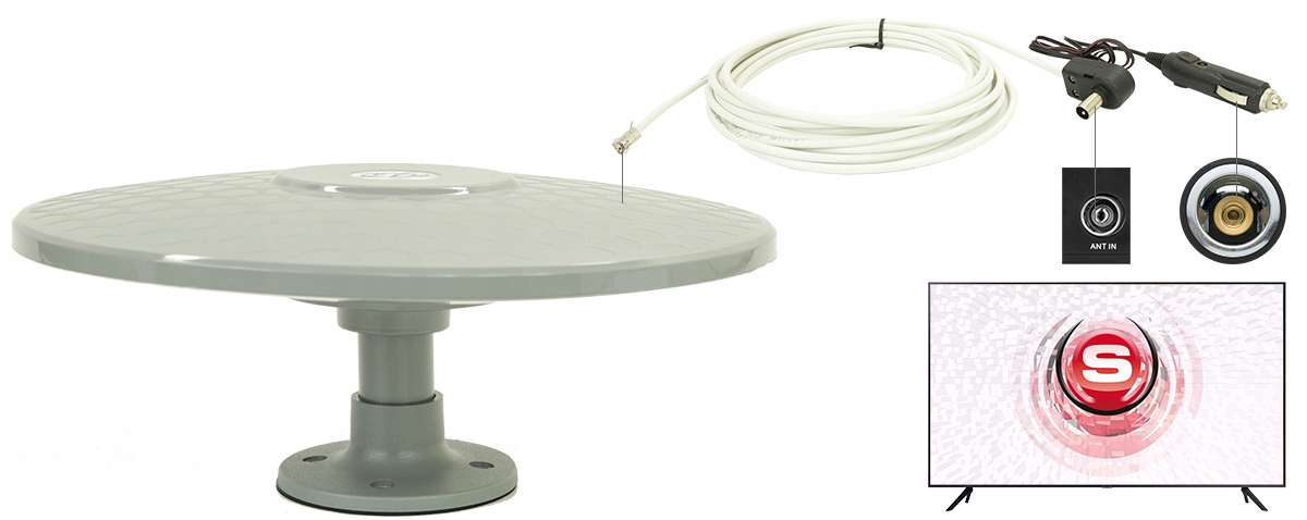 Антенна DVB-T2 поставляется с готовым для установки с помощью коаксиального кабеля. Антенна оснащена питанием 12V, которое обеспечивает правильное функционирование усилителя, встроенного в антенну. Вилка антенны УВЧ вы подключаете непосредственно в гнездо в приемнике, а с другой стороны, вы ввинчиваете в гнездо, встроенное в антенна. Питание осуществляется через штекер прикуривателя 12 В-вы подключаете его к любому источнику мощность (прикуриватель).