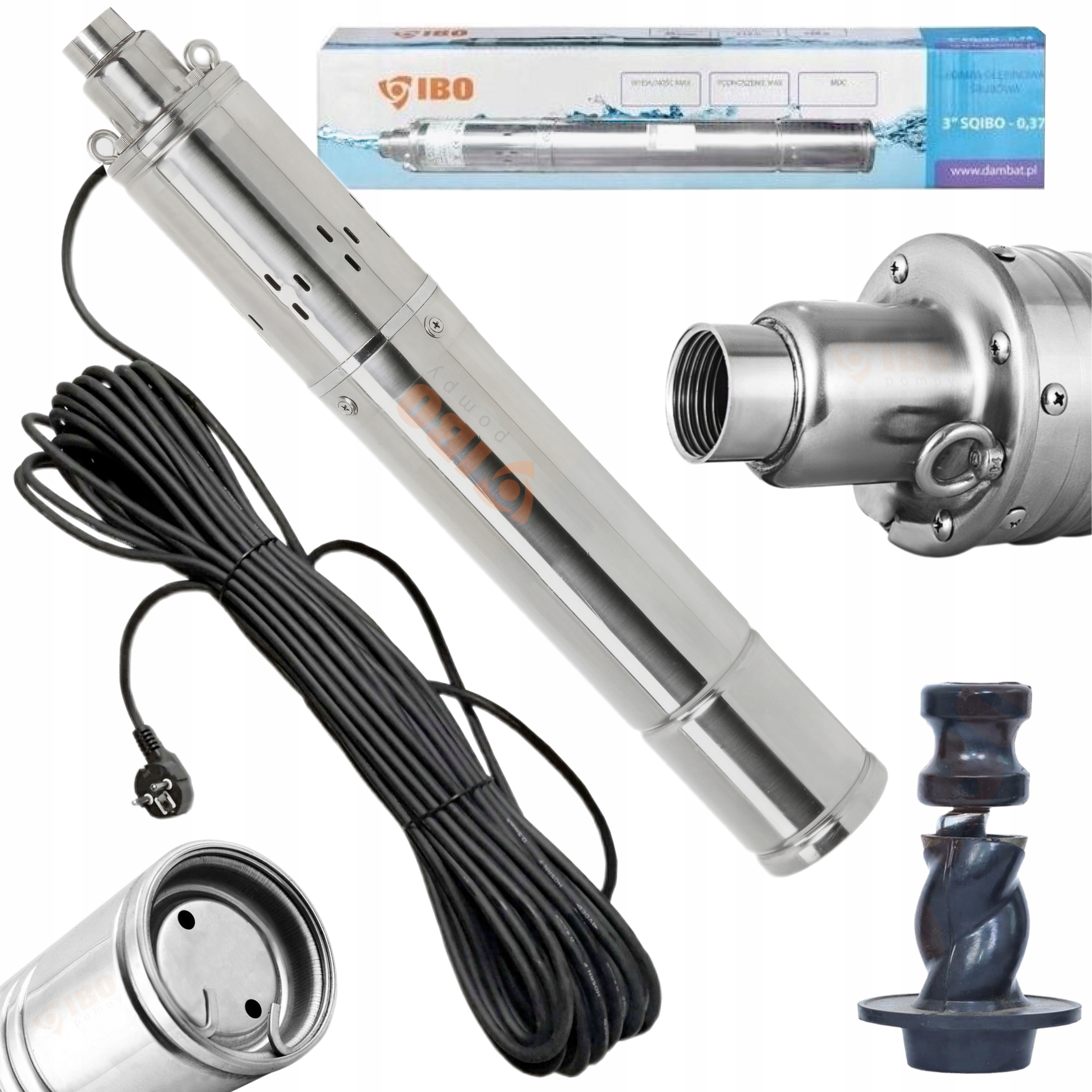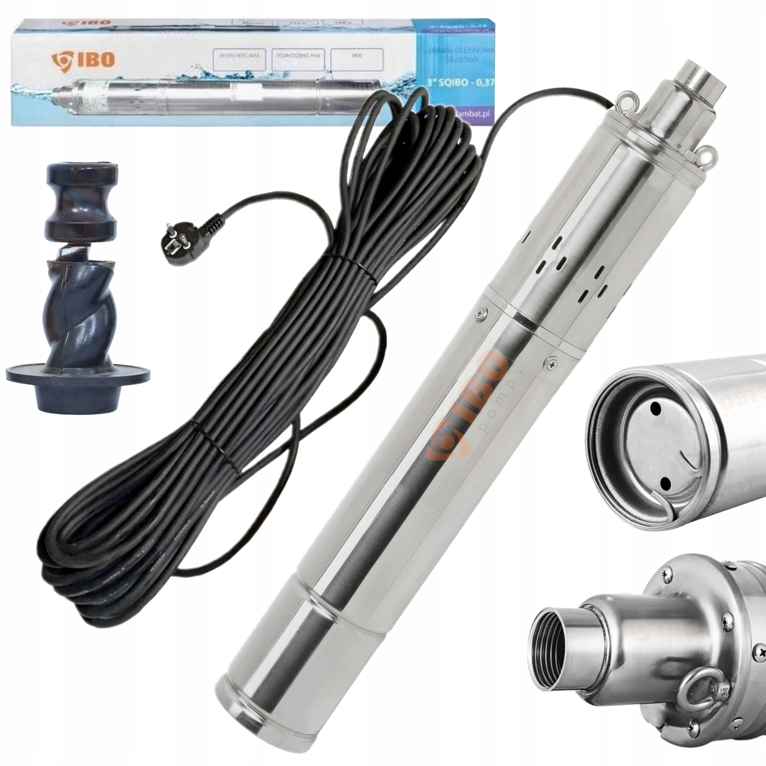 Wyporowe pompy głębinowe o średnicy 76mm. Pompy w głównej mierze wykonane zostały ze stali nierdzewnej np. obudowa, śruby, króćce oraz rotor. Pompy wyposażone zostały w różnej długości przewody elektryczne zakończone wtyczką w zależności od potrzeb użytkownika. Dzięki zabudowaniu kondensatora w silniku, od razu po rozpakowania pompa jest gotowa do montażu. Pompa wyposażana została w zabezpieczenie termiczne zamontowane w uzwojeniu silnika. Pompy z serii SQIBO są jednymi z najpopularniejszych pomp śrubowych na polskim rynku. Uznanie klientów zyskały dzięki solidnej konstrukcji i atrakcyjnej cenie.