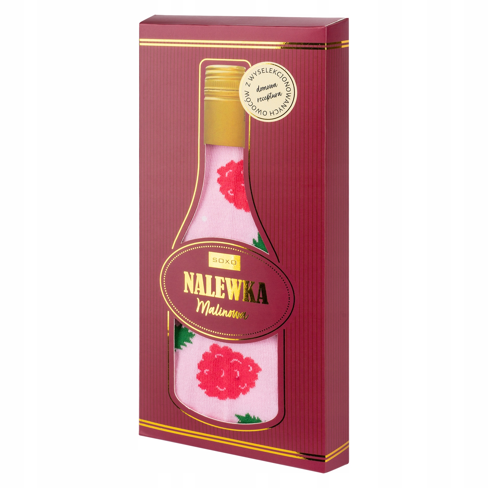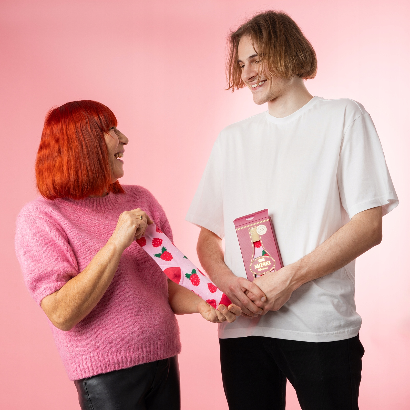 Jeśli szukasz pomysłu na niebanalny i uroczy prezent dla kobiety, te kolorowe skarpetki z motywem malinowej nalewki będą strzałem w dziesiątkę! Zapakowane w elegancki kartonik, wyglądają jak mały upominek prosto z domowej spiżarni – ale dla stóp! 🎁✨