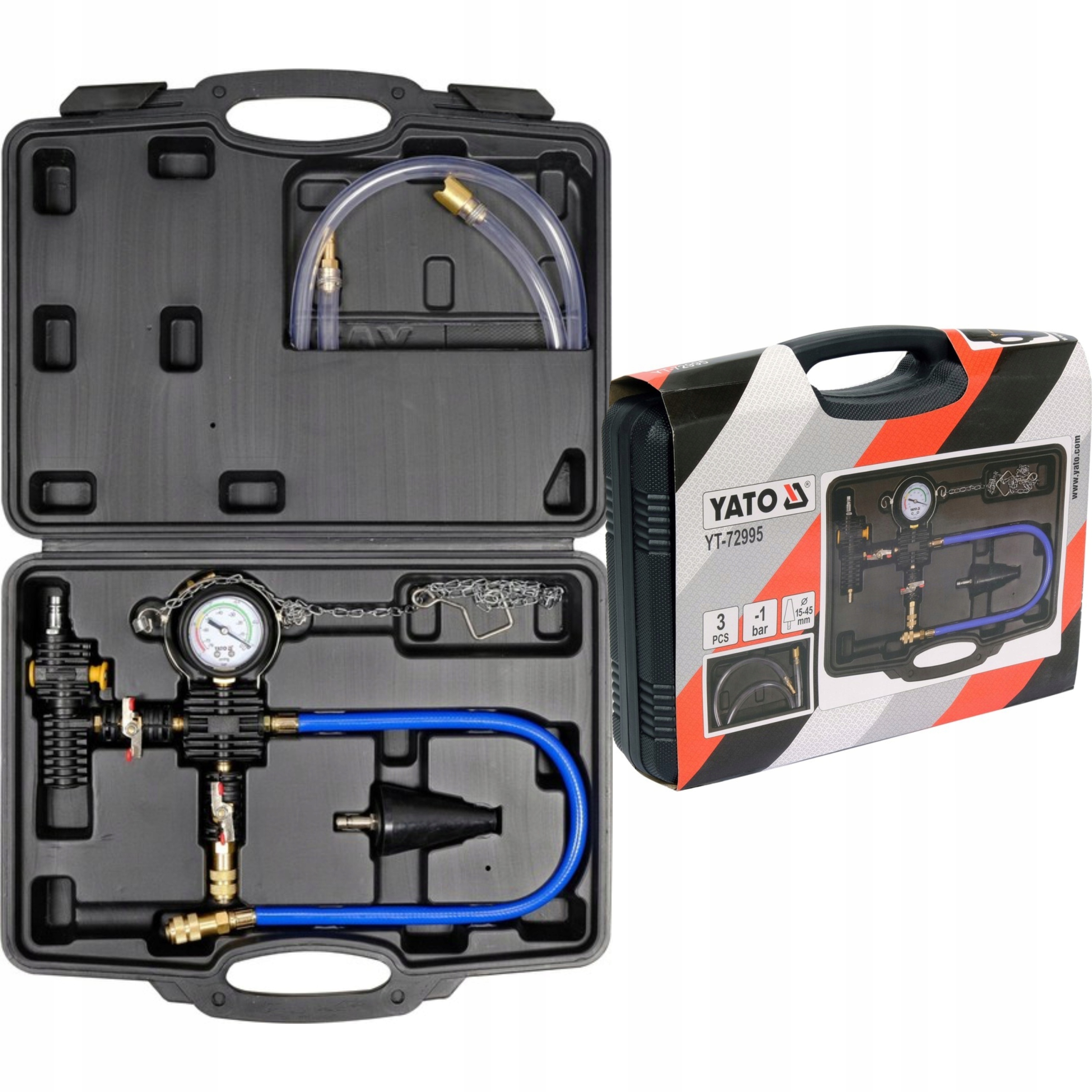 Комплект YT-72995 предназначен для быстрого вакуумного заполнения охлаждающей жидкости системы без образования пузырьков воздуха. Это устраняет необходимость вентиляции системы охлаждения, сокращая время обслуживания автомобиля. В комплект входит манометр в резиновой оболочке, провод подача охлаждающей жидкости и конус / редуктор с диапазоном поддерживаемых диаметров от 15 до 45 мм. Все упаковано в прочный чемодан.