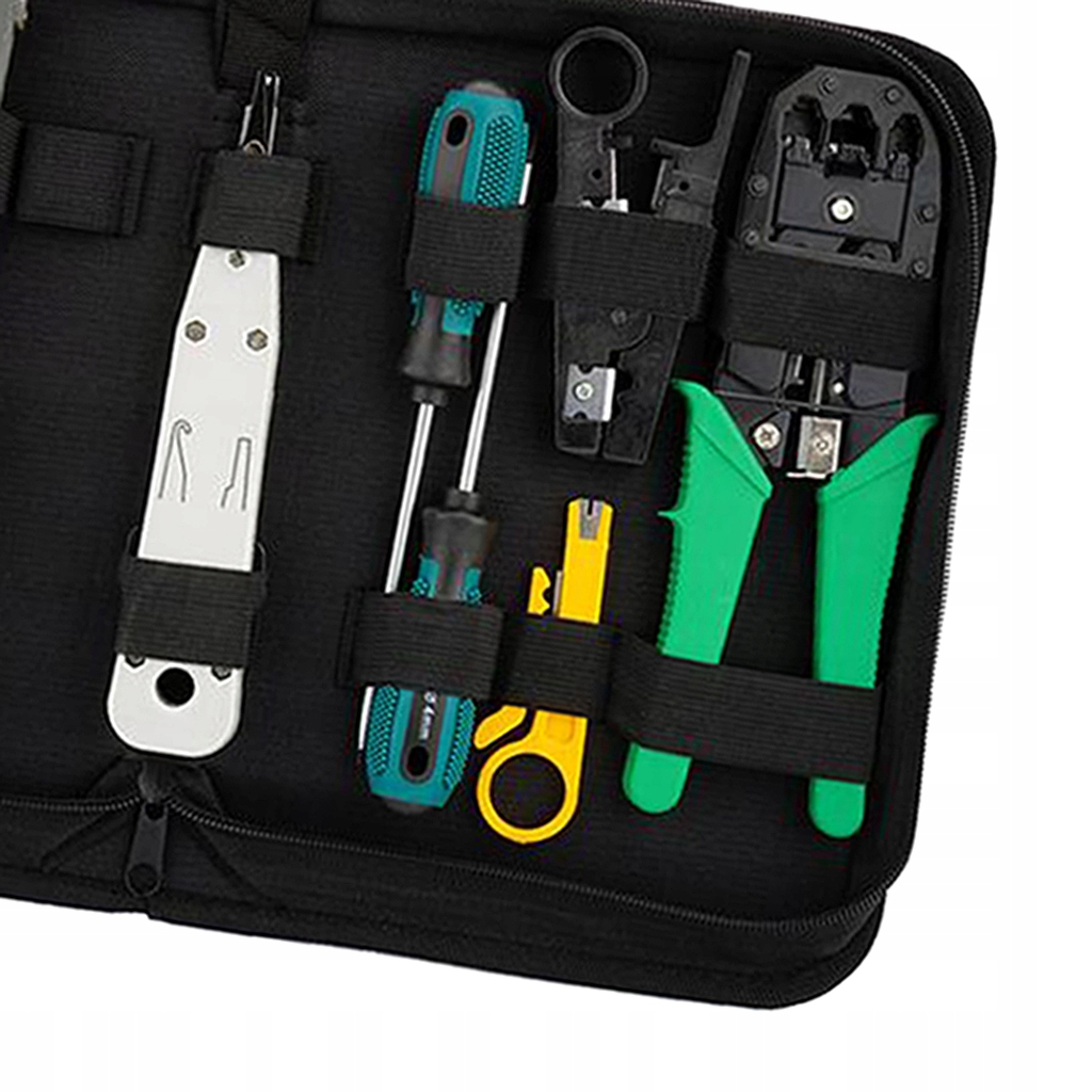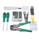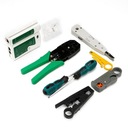 Zestaw narzędzi 11 w 1 zawiera szczypce do zaciskania, kable sieciowe testera, nóż do ściągania do, śrubokręt płaski/ krzyżakowy, nóż do ściągania do, narzędzie do dziurkowania do i złącza RJ45