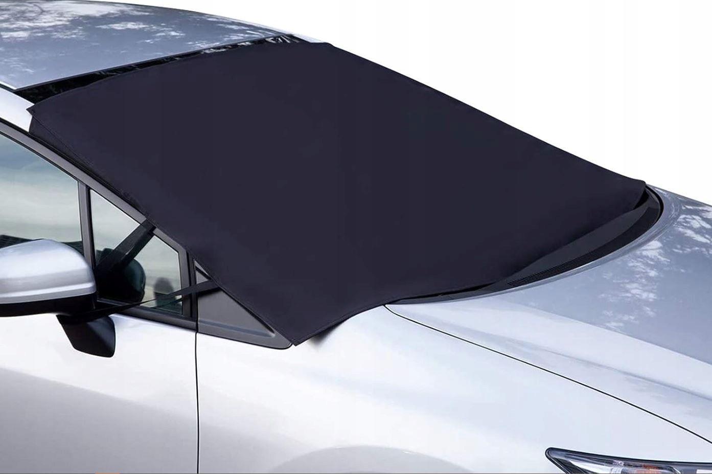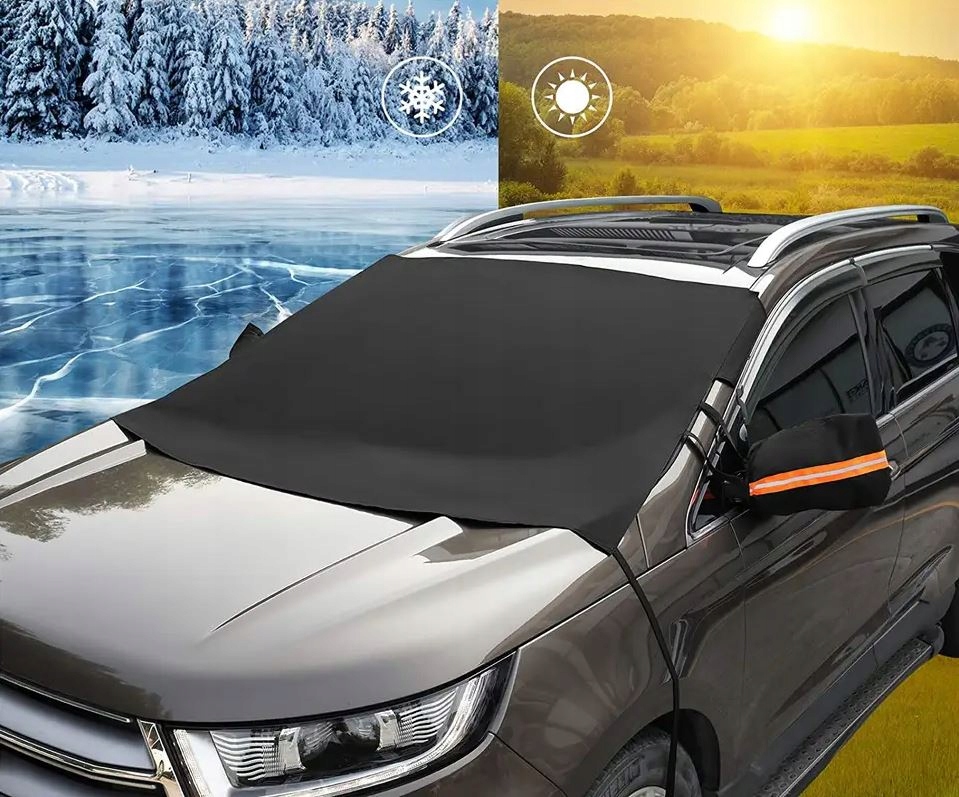 Instalacja maty jest bardzo prosta - wystarczy przycisnąć ją wycieraczkami od dołu i przytrzasnąć zakładki boczne przednimi drzwiami. Dodatkowo osłona posiada uchywyt na lusterka oraz wszyte pod materiałem magnesy, które przyczepiają się do samochodu, zapewniając solidne mocowanie, nawet podczas wietrznych dni.