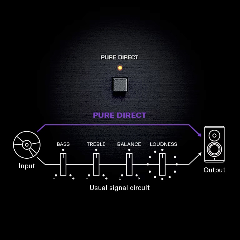 Режим Pure Direct позволяет музыкальным сигналам путешествовать по кратчайшему возможному маршруту, с обход буферного усилителя и регуляторов тона, громкости и баланса, чтобы практически устранить любую деградацию сигнала и получить чистейшее качество звука.
