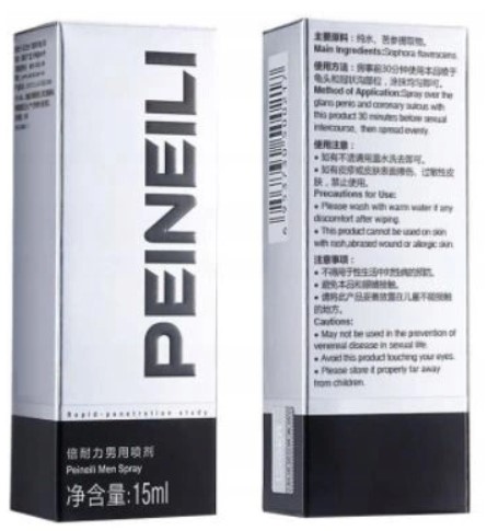 Peineili spray dla mężczyzn, obniża dotykową wrażliwość penisa podczas stosunku ,dzięki czemu opóźnia wytrysk (w przypadku przedwczesnego lub zbyt szybkiego wytrysku).