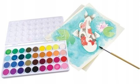 Zestaw farb akwarelowych w 36 pięknych kolorach zebranych w poręcznym pudełku. Łatwo z nich korzystać nie tylko w domu. Opakowanie można zamknąć i zabrać ze sobą do szkoły, w podróż lub w plener. Do farb dołączony jest cienki pędzelek idealnie pasujący do tego zestawu. Ogromnym atutem akwarel Ooly jest ich zmywalność nie tylko z rąk. Także na ubraniach nie zostaną po nich plamy.