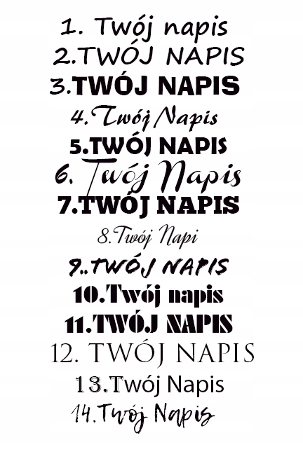 Jesli życzysz sobie napis, wybierz numer czcionki, i podaj nam kolor jakim mamy go wykonąć, jesli nie odpowiada Ci czcionka z zaprezentowanych podaj nam nazwę swojejJesli napis składa sie z kilku wyrazów napisz nam w ilu linijkach mamy go wykonać