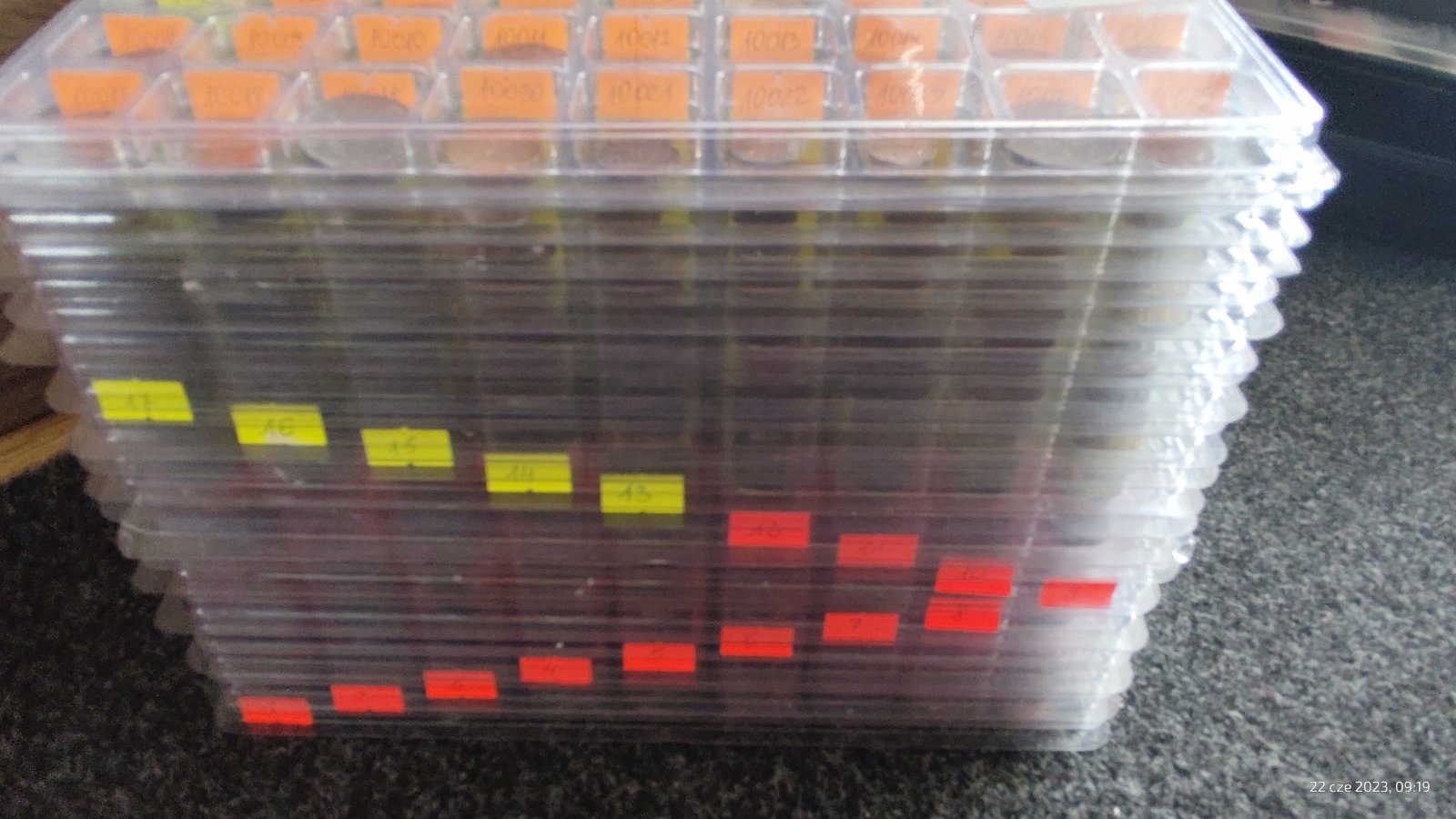 Przedmiotem oferty jest plastikowa przezroczysta tacka która może służyć do przechowywania monet. 81 wgłębień o średnicy 27mm. Tacki mogą posiadać ślady naklejek, ponieważ pochodzą one po moich zbiorach. Doskonałe na segregacje monet wg. Państw lub tematycznie. Do każdych zakupionych 10 sztuk pokrywka gratis. Tacki są piętrowalne więc skompletowanie kilku tysięcy monet zajmuje mało miejsca. Zapraszam do zakupu.