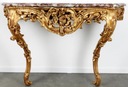 Wyjątkowo wysokiej klasy mebel wykonany w XVIII w. Pochodzący z Pałacu na obrzeżu Paryża, wykonany w stylu i epoce Ludwika XV, tzw. Francuskiego rokoka pełnego dynamizmu wykończony liśćmi akantu i kwiatami. Bardzo duży ręcznie rzeźbiony w litym drzewie i pokryty złotem i udekorowany blatem z marmuru.