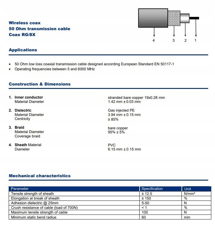 Średnica zewnętrzna ~6.15mm (minimalnie grubszy np. od RF-5, H-155), oplot miedź 95%. Żyła gorąca linka miedziana 19x0.28mm.