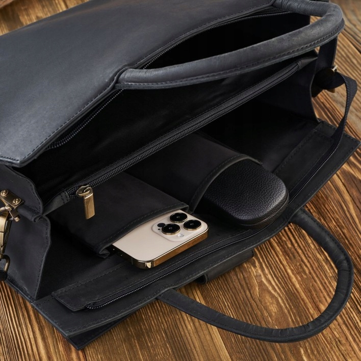 ✔ Dodatkowo na boku komory umieszczona została kieszeń na suwak, w której z powodzeniem zmieścisz np. portfel. Po przeciwległej stronie znajdują się dwie kieszenie wsuwki ze skórzaną lamówką w których można schować np. telefon lub notatnik. Dno teczki zostało zabezpieczone przed uszkodzeniami metalowymi, mosiężnymi stopkami.