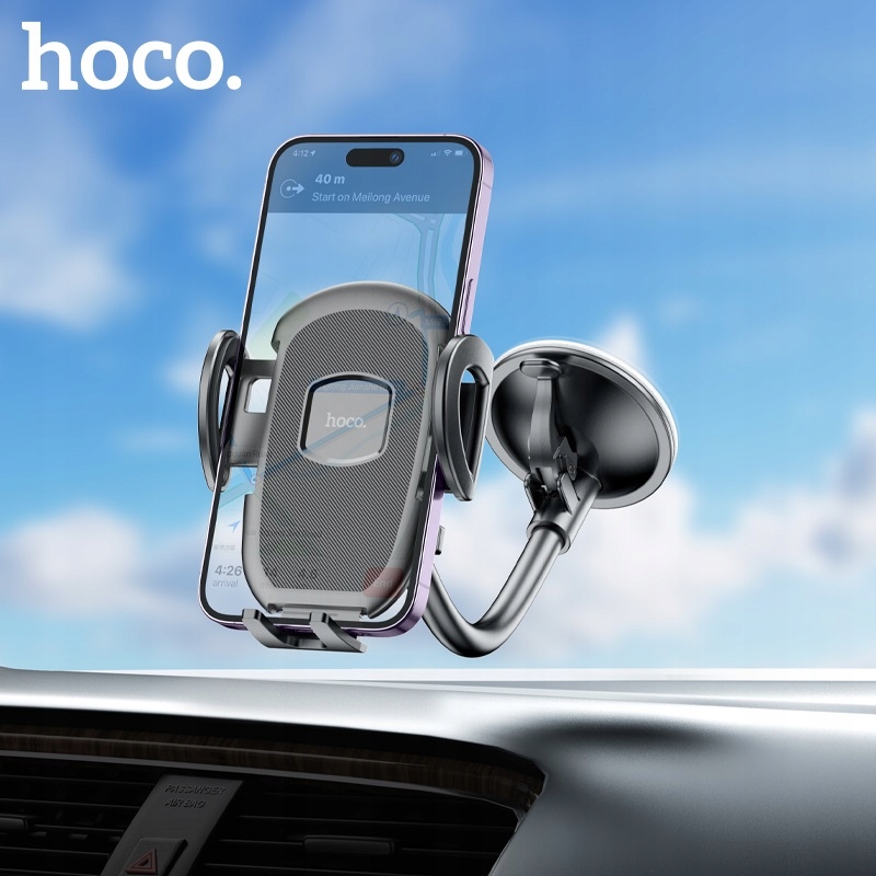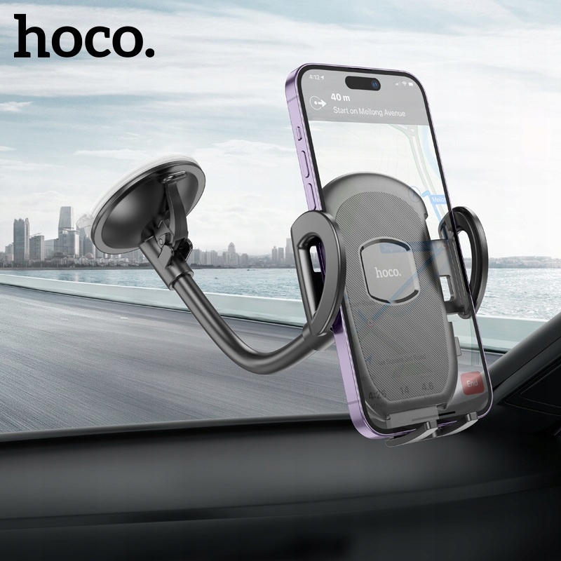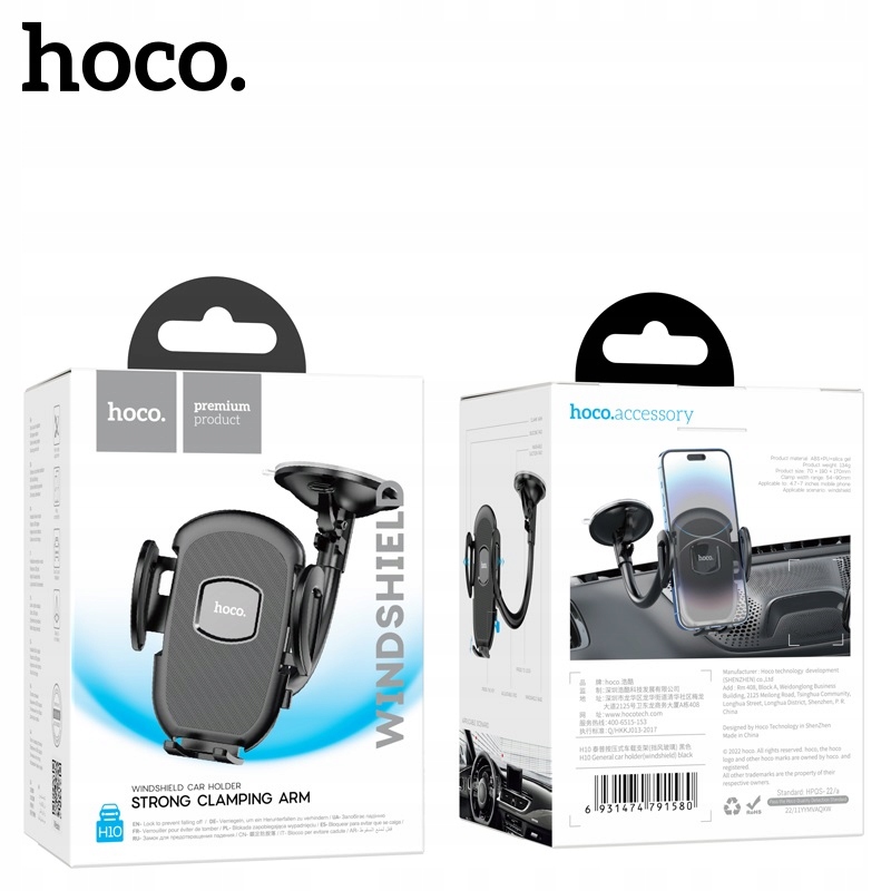 hoco. H10 General to samochodowy uchwyt zaciskowy do telefonu / na telefon, z przeznaczeniem do montażu na szybę / do szyby pojazdu, wyposażony w elastyczne, regulowane ramię, dające nieograniczone możliwości regulacji i dostosowania do własnych potrzeb kierowcy oraz przegub kulowy, mocowany za pomocą przyssawki silikonowej z zaciskiem, przeznaczony do telefonów komórkowych / smartfonów lub tabletów o wadze nie większej niż 0,5 kg i wielkości wyświetlacza od 4.5 do 7 cali. Uchwyt posiada dodatkowo regulowane stopki dolne.