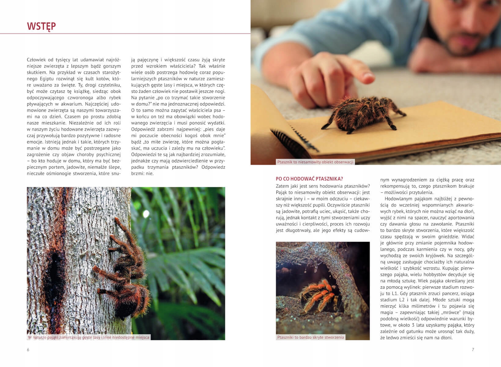 Ptaszniki, które coraz częściej dołączają do grona domowników, to piękne, intrygujące i nieco tajemnicze stworzenia, a podglądanie ich sekretnego życia, obserwowanie jak budują sieci, polują czy pielęgnują swe włochate ciała może się okazać fascynującą przygodą. Odpowiednio hodowane, nie stanowią zagrożenia, trzeba jednak stworzyć im odpowiednie środowisko, zapewnić optymalne warunki i pamiętać o kilku ważnych zasadach, omawianych w niniejszym atlasie.