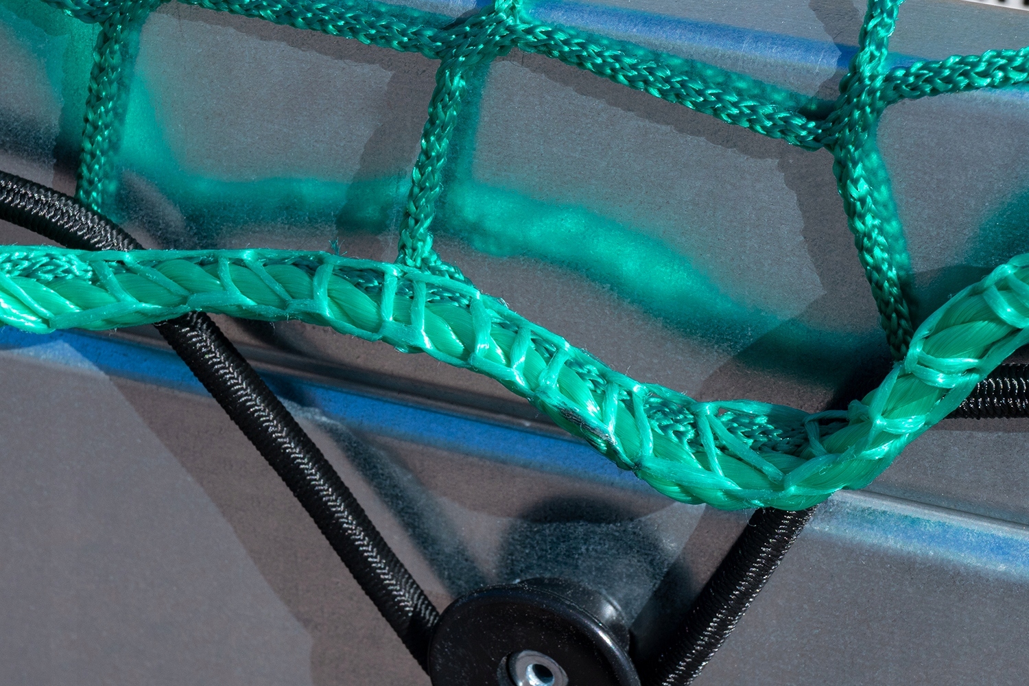 Siatka została wykonana z włókna. Na obrzeżach zakończona jest wzmocnionym rantem. Dodatkowo dookoła została poprowadzona gumowa linka, która ułatwia mocowanie siatki na przyczepie.