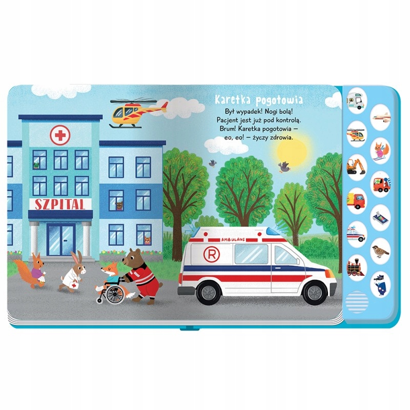 Posłuchaj, jak brzmią: kamper, samolot, helikopter, koparka, radiowóz, lokomotywa oraz inne pojazdy, zwierzęta i przedmioty pokazane w książce