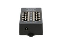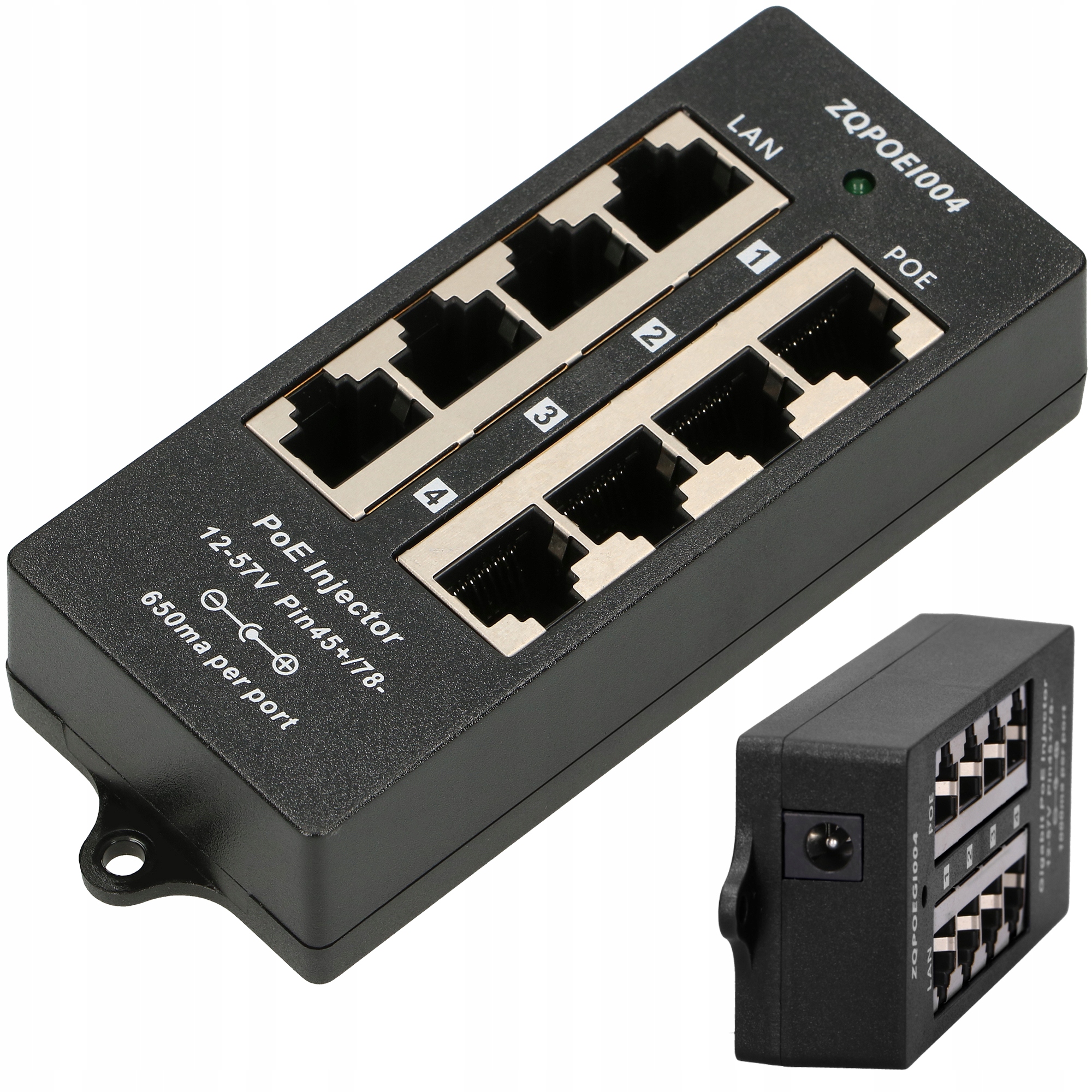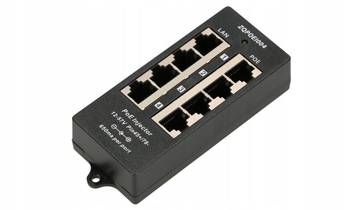 Panel zasilający z czterema portami PoE może zasilać do 4 urządzeń. Złącza RJ45 umieszczone po jednej stronie urządzenia są portami Ethernet bez zasilania (przełącznik), po przeciwnej stronie znajdują się porty do podłączenia zasilania kabla Ethernet, tj. 4, 5 (biegun dodatni) i 7, 8 (biegun ujemny).