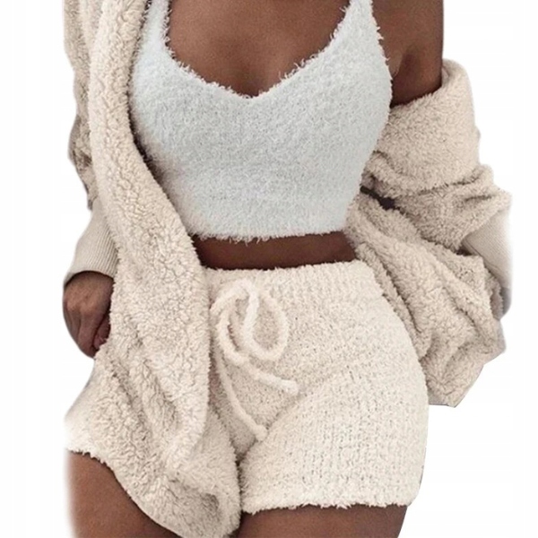 Pluszowa ciepła trzy częściowa piżama top spodenki narzutka kremowa (#447)