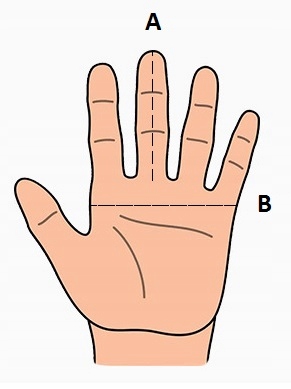 Zmierz długość swojego palca środkowego (wymiar A) oraz obwód ręki (wymiar B).