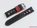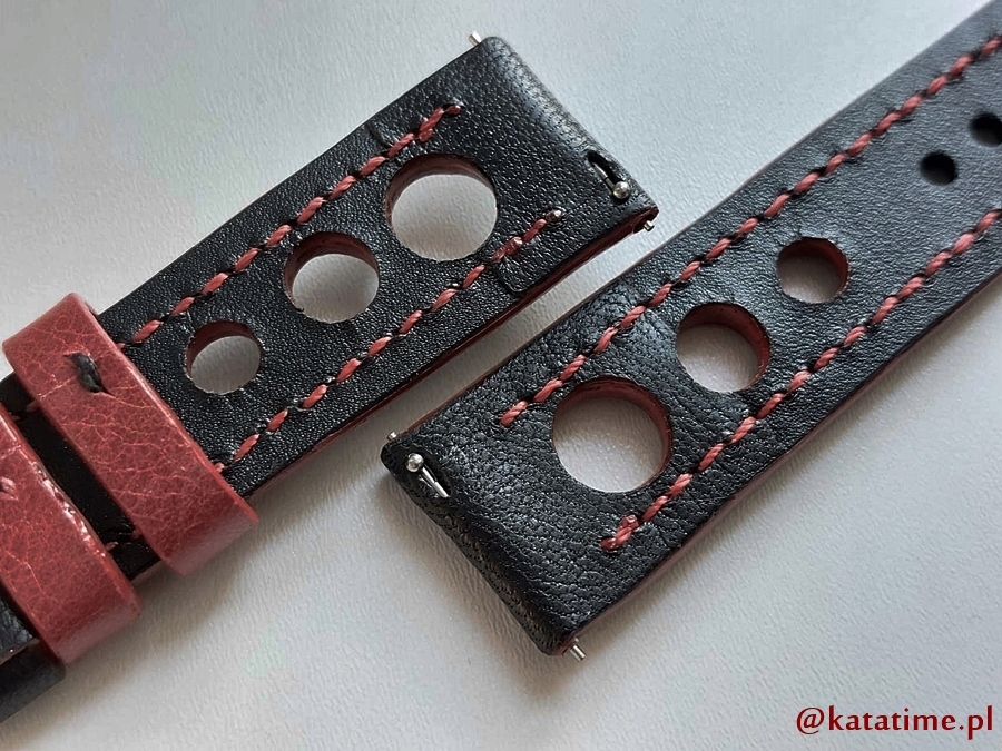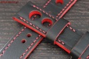 W całości ręcznie robiony, rzadkiej urody pasek do zegarka typu RALLY. Naturalna, licowa skóra polska w kolorze czarnym, półmatowa, gładka, szycie nicią średnio grubą, w kolorze czerwonym. Spód paska jest także wykonany z naturalnej skóry licowej, dzięki czemu pasek będzie dłużej służył i wygodniej się nosił niż standardowe, seryjne paski, taki pasek posłuży lata. Boki szlifowane, lakierowane w kolorze czerwonym.