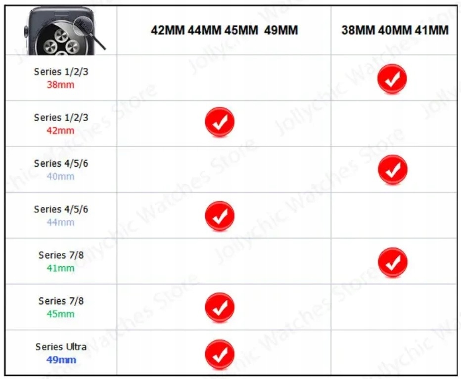 Pasek szer. 22 mm przy teleskopach (przy kopercie) posiada dodatkowo adaptery do Apple Watcha (do wyboru adaptery 38/40/41 mm albo 42/44/45/49 mm). Na zdjęciu tabela z modelami i pasującymi adapterami.