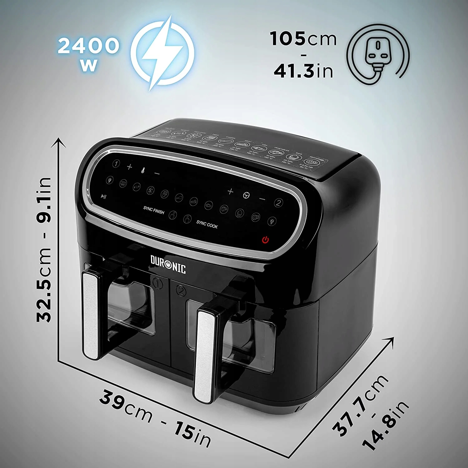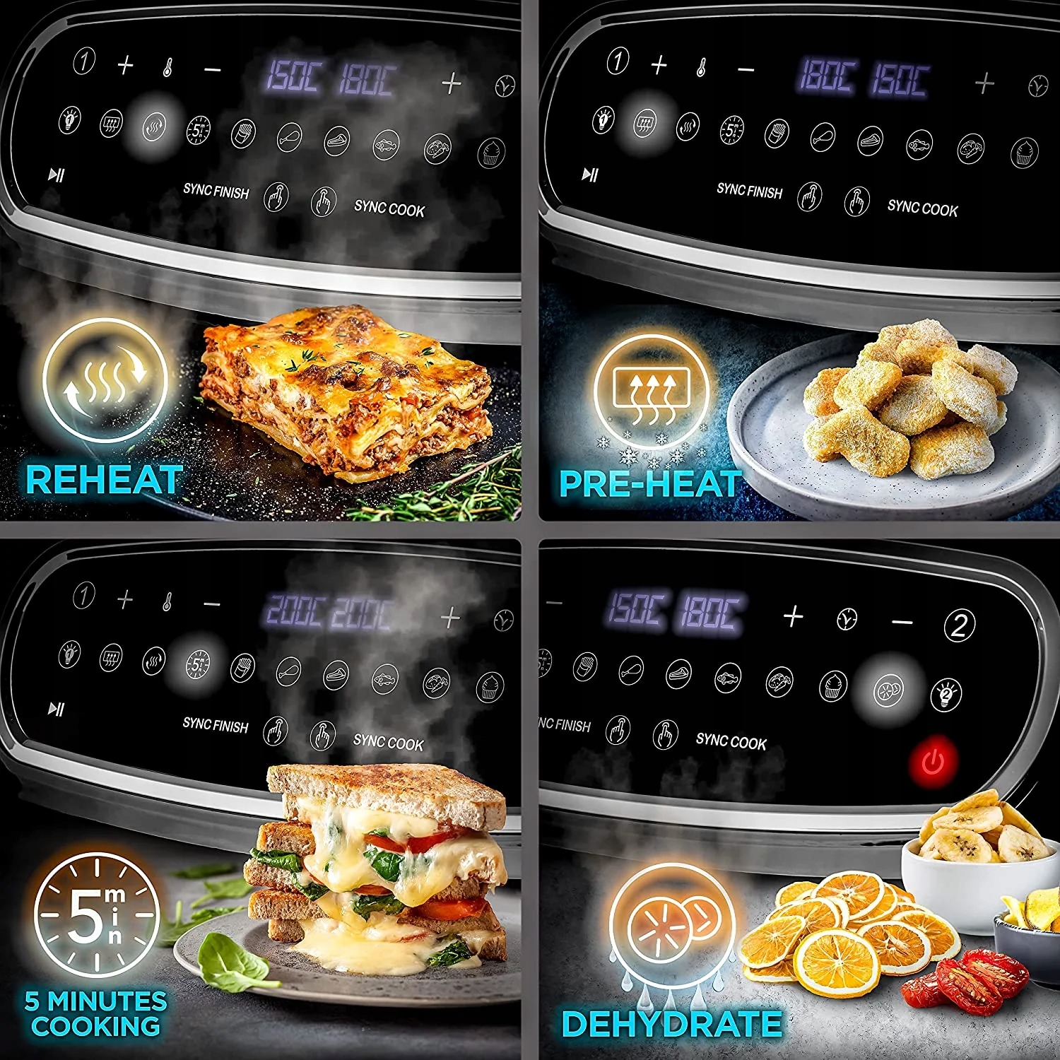 Nie musisz zastanawiać się jak przygotować poszczególne składniki. Dzięki 10 wstępnie zdefiniowanym programom do gotowania od razu możesz wybrać właściwy czas i temperaturę dla np. ciasta, ryb czy frytek. Możesz też odgrzać jedzenie lub np. ususzyć grzyby i owoce. Tryb Sync Cook pozwala skopiować ustawienia dla obu szuflad, a Sync Finish umożliwia gotowanie z różnymi ustawieniami zaprogramowanymi tak, aby oba kończyły się w tym samym czasie.