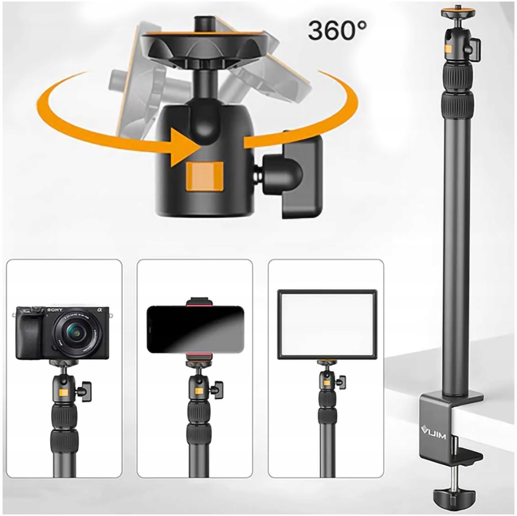 Głowica kulowa 360 stopni pozwala ustawić aparat lub akcesoria pod dowolnym kątem. Wygodnym pokrętłem zablokujesz ją w odpowiedniej pozycji.