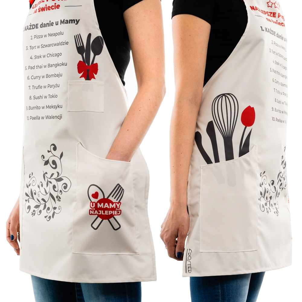 Napis na produkcie: Najlepsze potrawy na świecie, U mamy najlepiej. Wymiary: rozmiar uniwersalny, rozmiar można regulować, regulowany pasek na szyi.