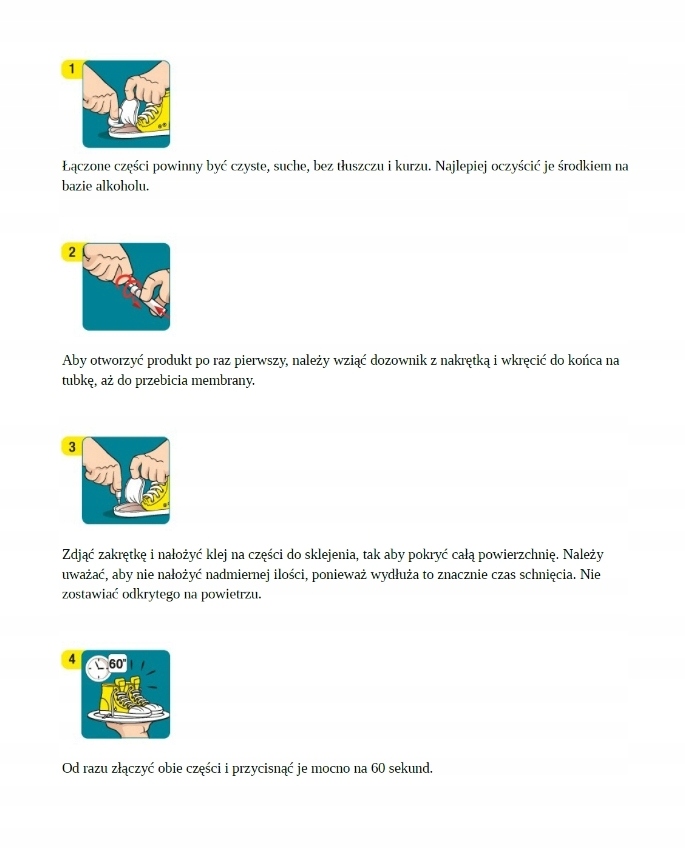 Łączone części powinny być czyste, suche, bez tłuszczu i kurzu. Najlepiej oczyścić je środkiem na bazie alkoholu. Aby otworzyć produkt po raz pierwszy, należy wziąć dozownik z nakrętką i wkręcić do końca na tubkę, aż do przebicia membrany. Zdjąć zakrętkę i nałożyć klej na części do sklejenia, tak aby pokryć całą powierzchnię. Należy uważać, aby nie nałożyć nadmiernej ilości, ponieważ wydłuża to znacznie czas schnięcia. Nie zostawiać odkrytego na powietrzu. Od razu złączyć obie części i przycisnąć je mocno na 60 sekund.